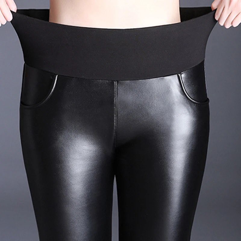 Осенне-зимние Новые облегающие кожаные брюки, леггинсы, женские эластичные брюки из искусственной кожи, женские бархатные теплые черные брюки с высокой талией 12237
