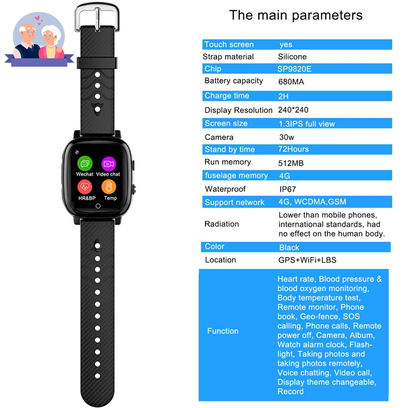 Сенсорный экран: ДаМатериал ремешка: силиконЧип: SP9820EЕмкость батареи: 680MAВремя зарядки: 2 чРазрешение дисплея: 240*240Размер экрана: 1,3 iPS full viewКамера: 30 ВтВремя работы: 72 часаПамять: 512 МбПамять корпуса: 512 МбВодонепроницаемый: IP67 (пожалуйста, не используйте его в горячей/соленой воде, горячий душ)Поддержка сети: 4G WCDMA GMSРадиация: ниже, чем мобильные телефоны, международные стандарты, не повлияло на человеческое телоРасположение: GPS + WIFI + LBSФункция:Пульсометр, мониторинг артериального давления и кислорода в крови, Тест температуры тела, удаленный монитор, телефонная книга, гео-забор, sos звонки, телефонные звонки, удаленное отключение питания, камера, альбом, часы-Будильник, вспышка, съемка и Съемка фотографий удаленно, голосовые чаты, видеозвоны, тема дисплея сменная, запись