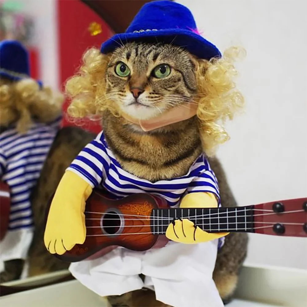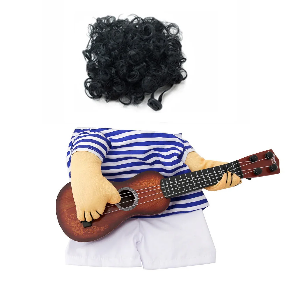 Забавный костюм собаки для косплея, гитарист, наряжающийся на вечерние, Рождество, Хэллоуин, новый год, одежда для собак, кошек, плюс парик