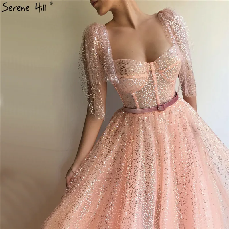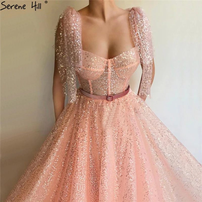 Дубай персик блестками платье на бретельках с поясом; Пикантные вечерние платья 2020 Рубашка с короткими рукавами блестящие официальное платье из тюли спокой DLA60944