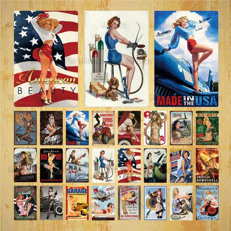 Металлические знаки Pin Up плакат с девушкой Ретро Винтаж Домашний декор гараж Автомобиль Мотоцикл самолет с сексуальной леди стикер стены YI-050