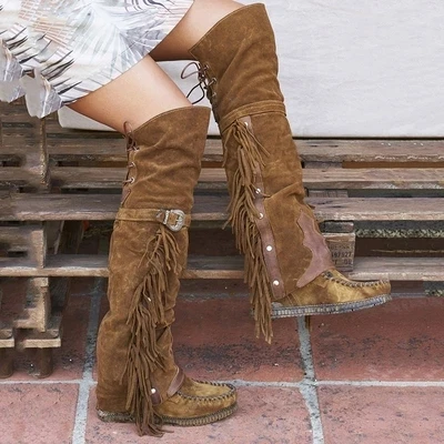 Красивые модные богемные высокие сапоги до колена в стиле бохо, Этнические женские высокие сапоги из искусственной замши с бахромой, женские длинные сапоги на плоской подошве для девочек