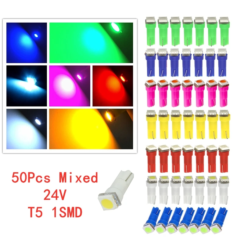 50 шт в наборе, 7 видов цветов Смешанные T5 1SMD 24V лампочки на приборной панели светодиодный свет лампы автомобиля Lnstrument индикатор AC лампы авто аксессуары для интерьера