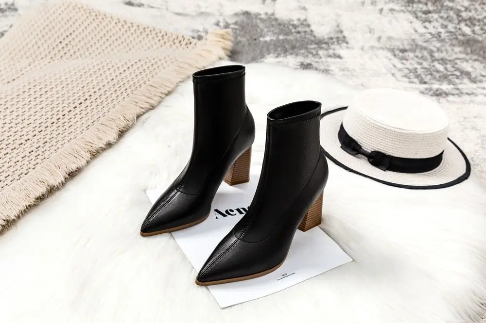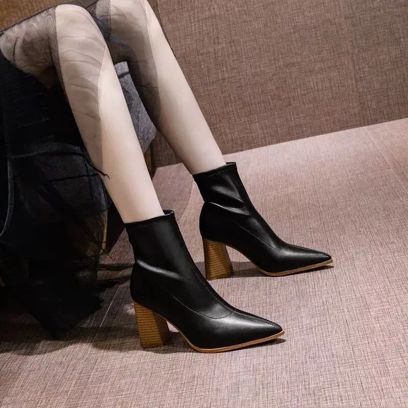 Короткие сапоги на толстом каблуке, Женские однотонные сапоги, Новинка осени и зимы 2021, тонкие сапоги стрейч до середины икры