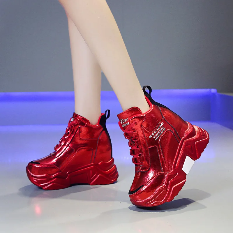 Женские зимние кроссовки на массивной платформе, серебристые и металлические кроссовки на очень высоком каблуке