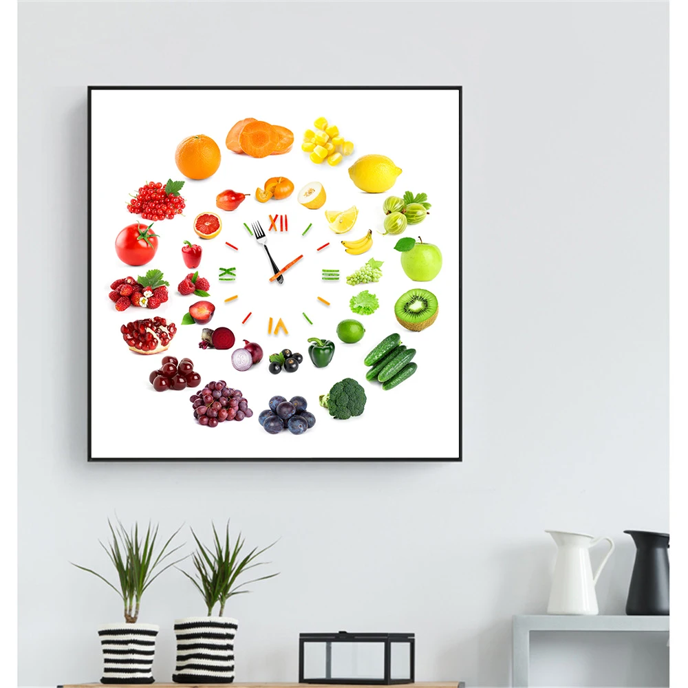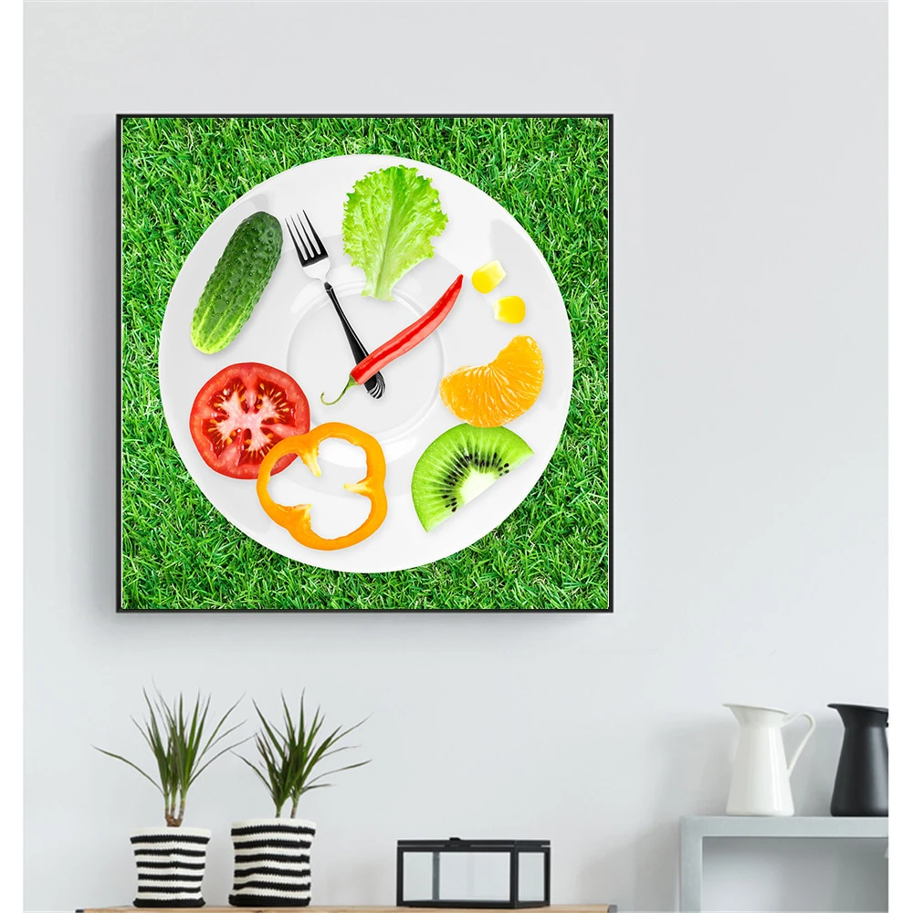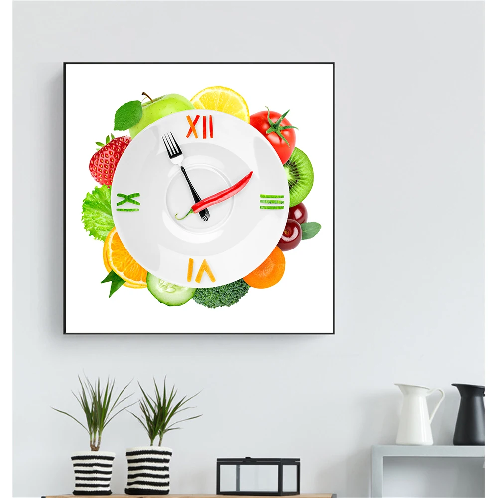 Плакат с часами в рамке, овощами, фруктами, креативная тарелка, томатом, лаймом, картины для украшения стен, холст, кухонный декор, Куадрос