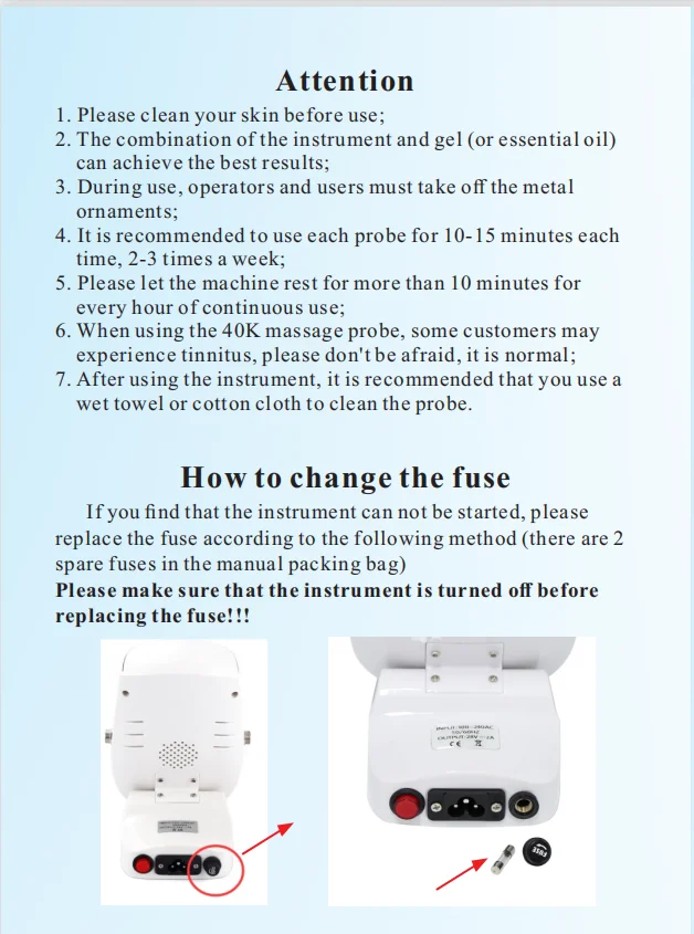 Аппарат прибыл раньше установленного срока. Упакован на совесть. При включении работает, но на практике не применяла, жду гели. Инструкция на английском языке, в наличии имеется 2 дополнительных предохранителя . Покупкой довольна, рекомендую. После применения дополню отзыв.