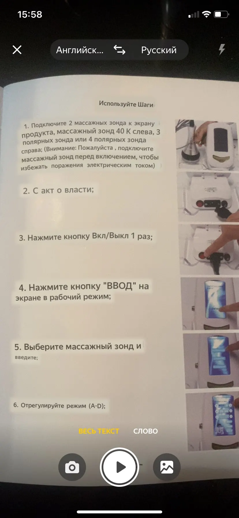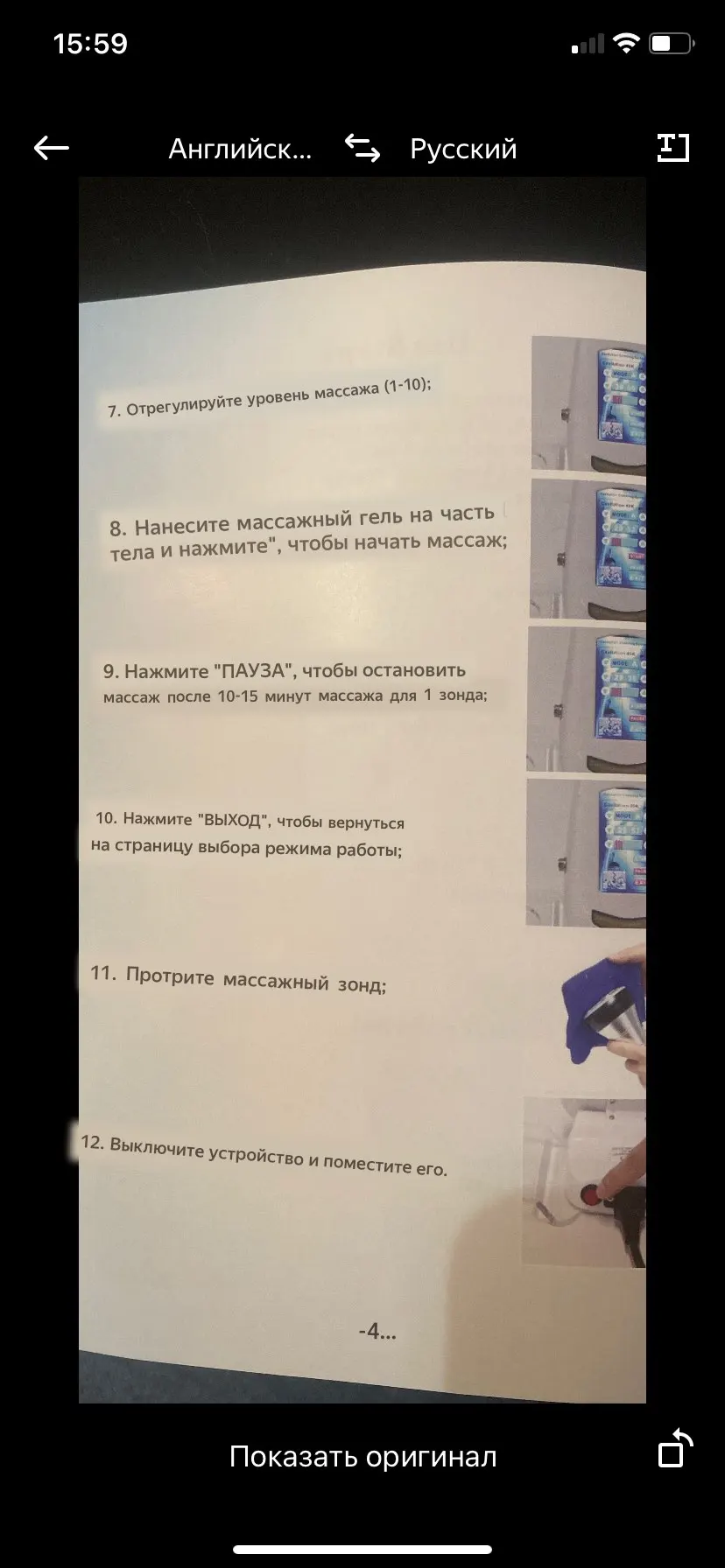 Заказ пришёл быстро, даже чуть раньше срока. Включила, проверила, все манипулы работают. Теперь осталось испробовать и ждать результата) P.s. у меня Яндекс переводчик по фото на телефоне - поэтому перевод с английского не проблема!