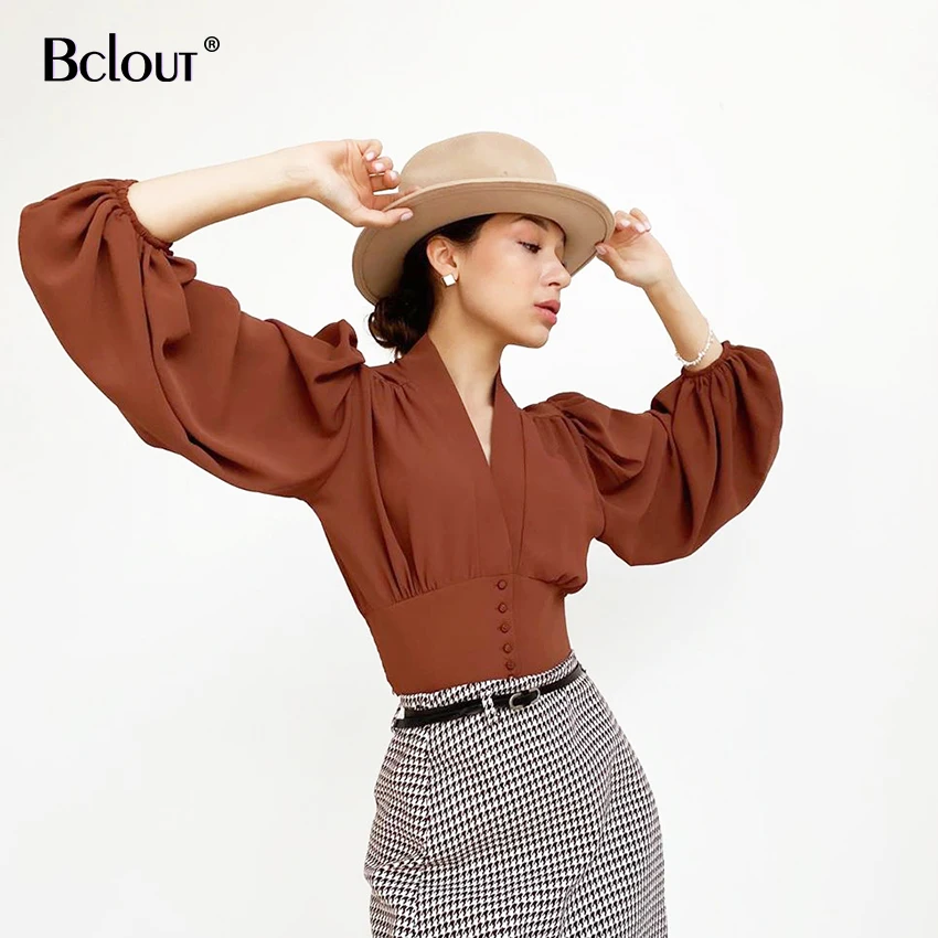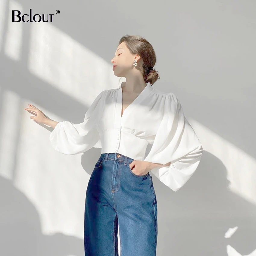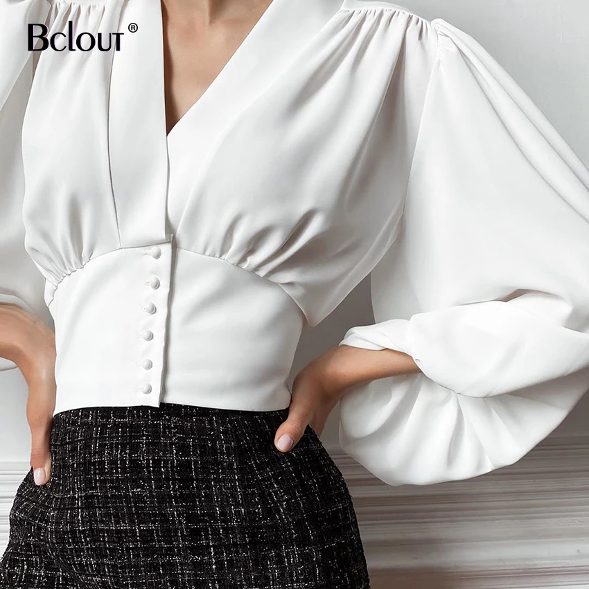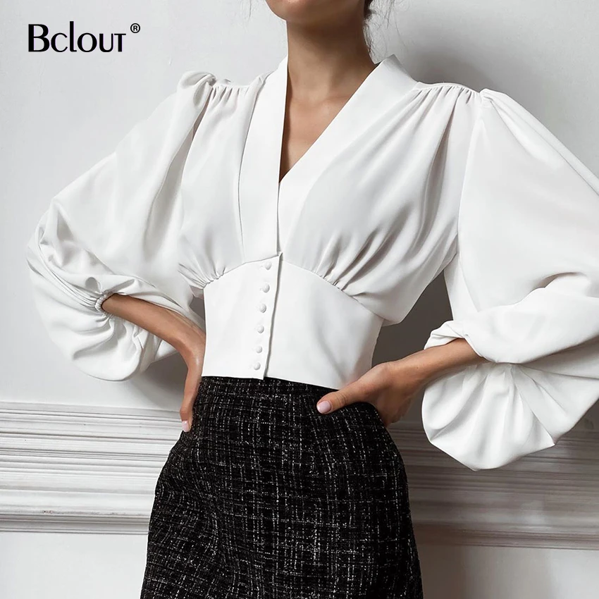 Блузка Bclout женская с V-образным вырезом, элегантная белая модная блузка с длинным рукавом, на пуговицах, с рукавом фонарик, на осень, новый год