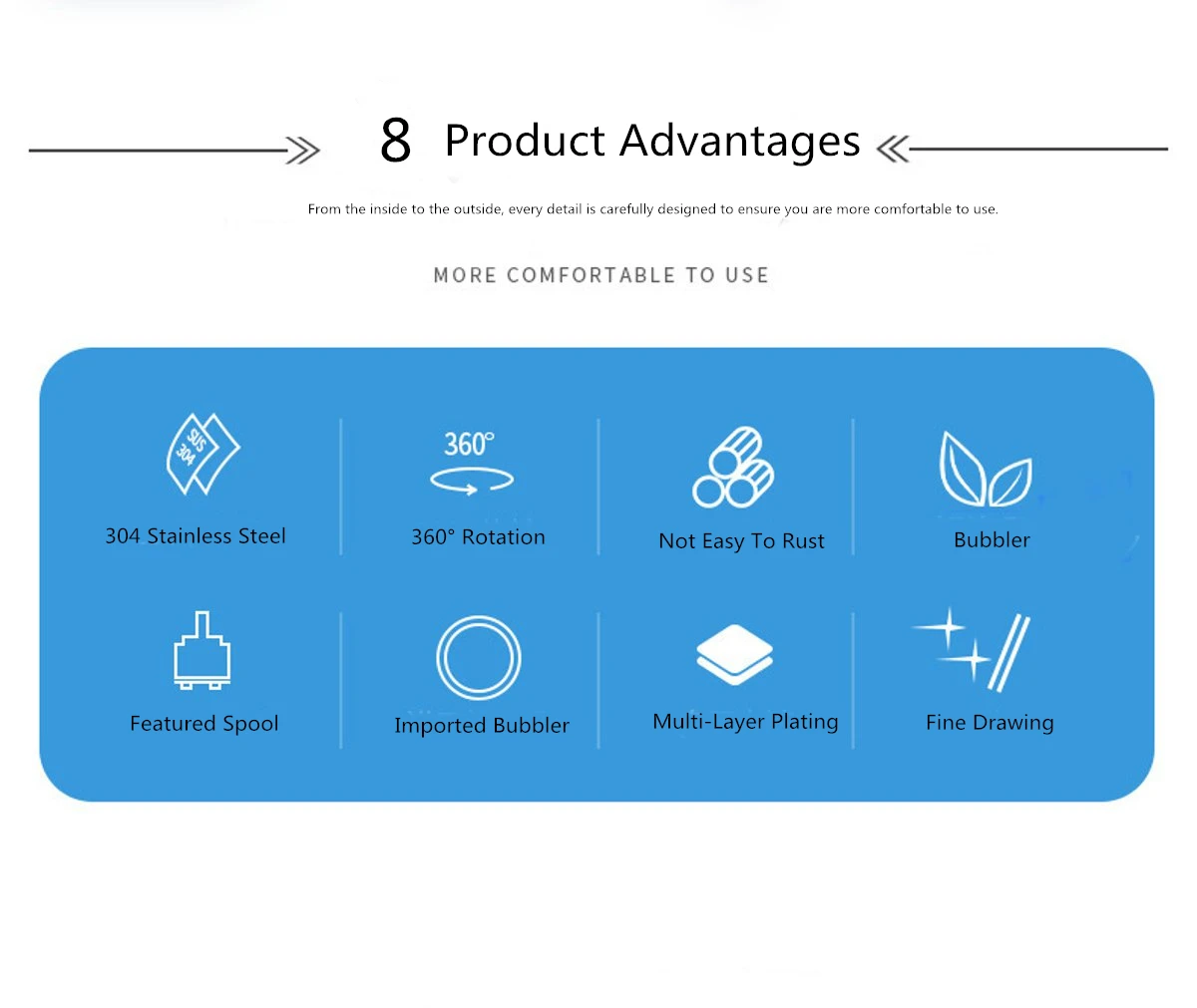 Особенность: 1. Роскошный верхний спрей, гладкий и чистый внешний вид, как Яркое Зеркало.2. Силиконовый отвод для воды, легко моется, не боится блокировки.3. Цельное литье, цельное литье, красивый и модный внешний вид.4. Универсальное соединение, которое подходит для большинства шлангов на рынке.5. 8 основных преимуществ продукта: нержавеющая сталь 304, вращение на 360 °, не ржавеет, барботер, выбранная сердцевина клапана, импортный барботер, многослойное гальваническое покрытие и мелкая проволока.