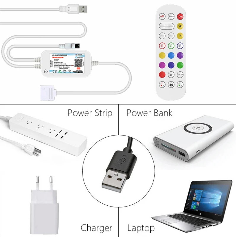 Alexa, включить/выключить {светильник name} Alexa, установите {светильник name} до 1%-100% Alexa, dim/brighten {светильник name} Alexa, увеличение/уменьшение {светильник name} Alexa, установите {светильник name} на красный... Alexa, измените название {светильник name} обратить внимание на цвет синий... Alexa, замените {светильник} на холодный белый Alexa, установите {светильник name} на каждый день светильник Напряжение: USB 5 В Выход: Макс. 2а/канал, общая мощность макс. 5А Приложение: Smart Life Название продукта: контроллер полосы WIFI Размер: 28x24x11.5мм Рабочая температура:-20-60 ° Длина usb-кабеля: 50 см Удаленное Расстояние: 10 м 1 шт. * WIFI мини-контроллер полосы 1 шт. * Руководство пользователя