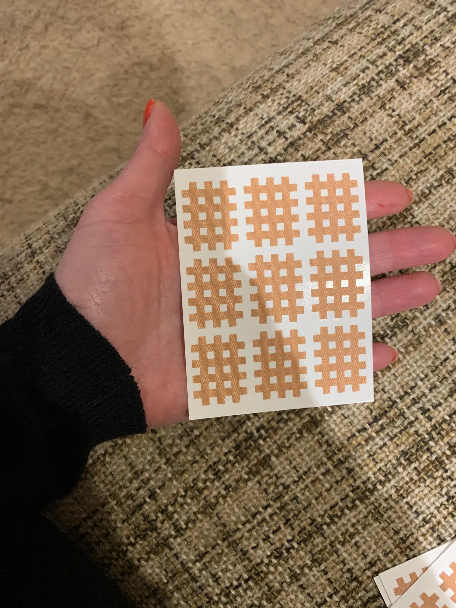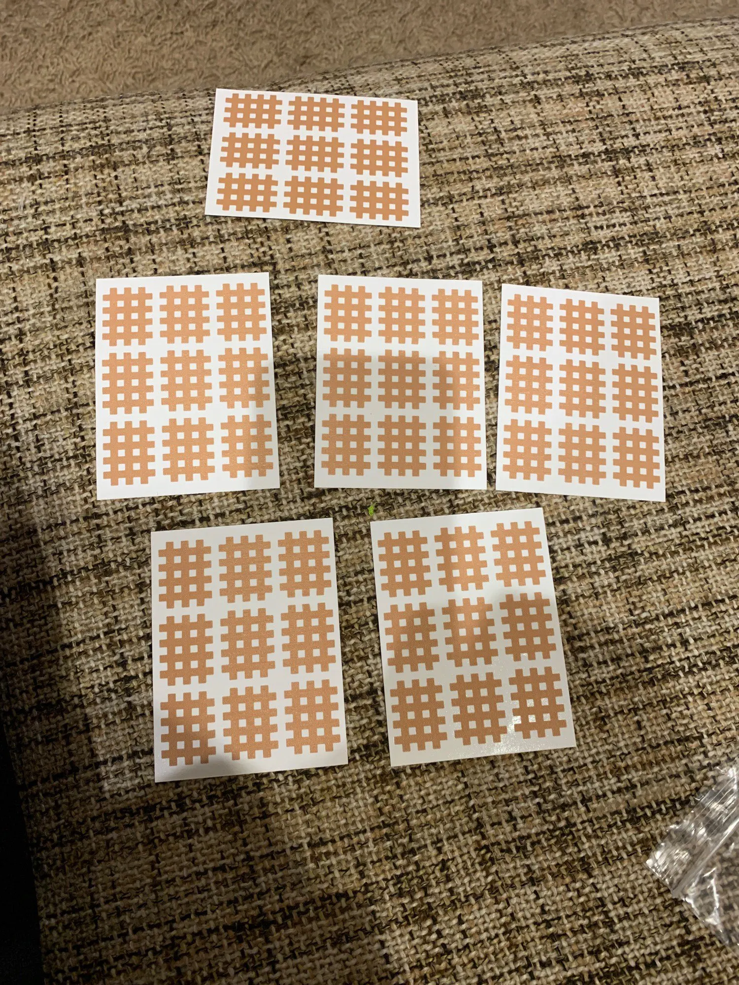 Тейпы сеточка. не сразу разобралась, что и сколько... оказалось, что в посылке всего 5 листочков с наклейками: 4 или 6,или 9 наклеек... Дороговато выходит: за 15 листочков более 600 руб♀️Там, где 4 наклейки, листочек просто поменьше того, что 6, а сеточка такая же. У другого продавца коробочка 20 листочков выходит меньше 400руб. Тейпы на тканевой основе, нормально держатся... после нескольких применений, заметен эффект. Рекомендую к применению.