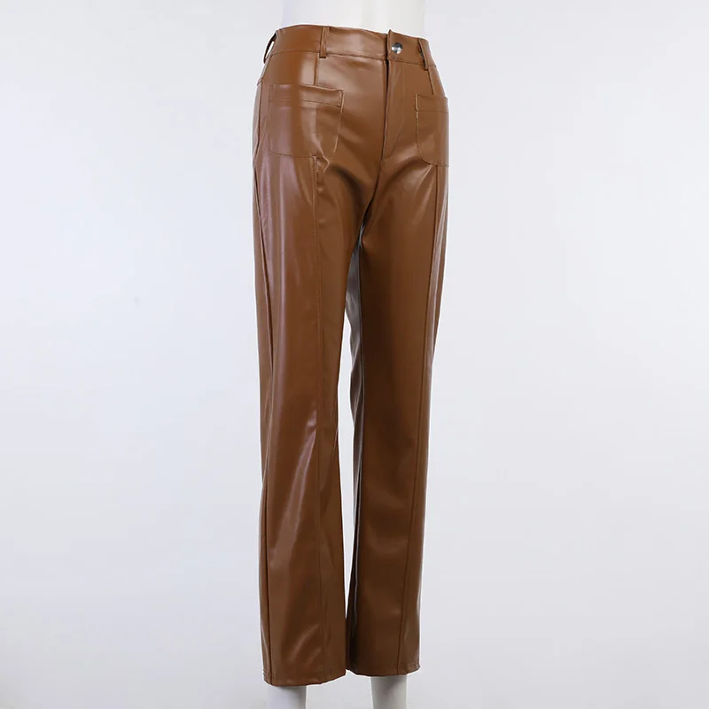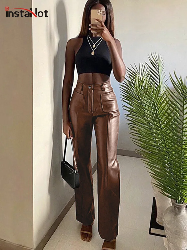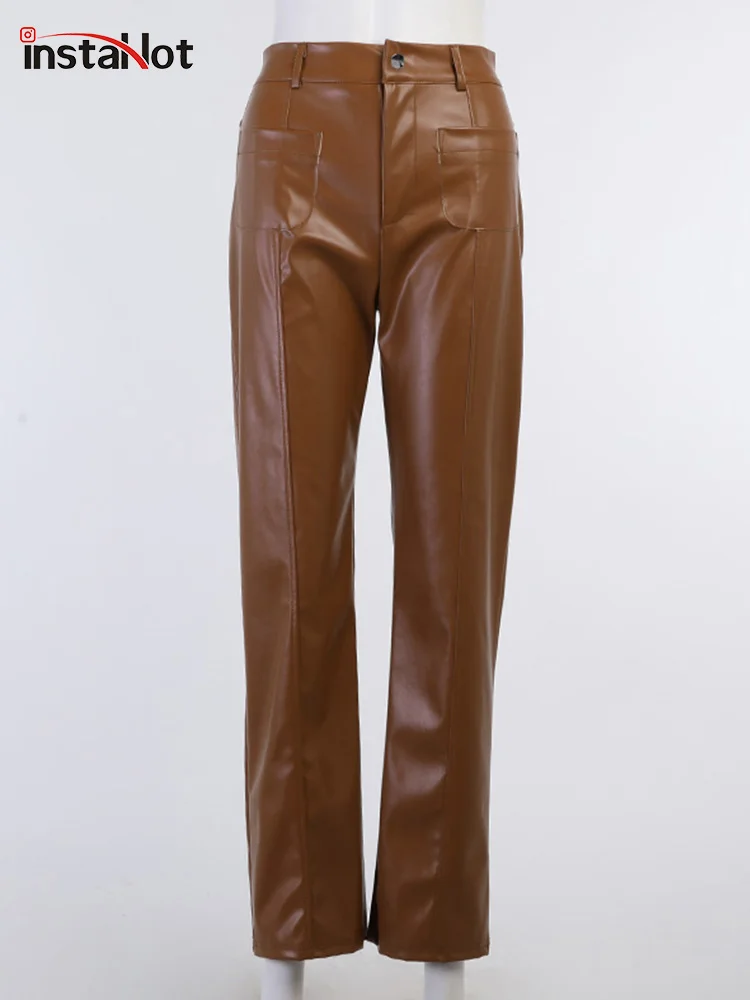 InstaHot женские прямые брюки из искусственной кожи, Брюки с карманами и высокой талией, уличная одежда 2020, офисные женские повседневные однотонные тонкие Капри