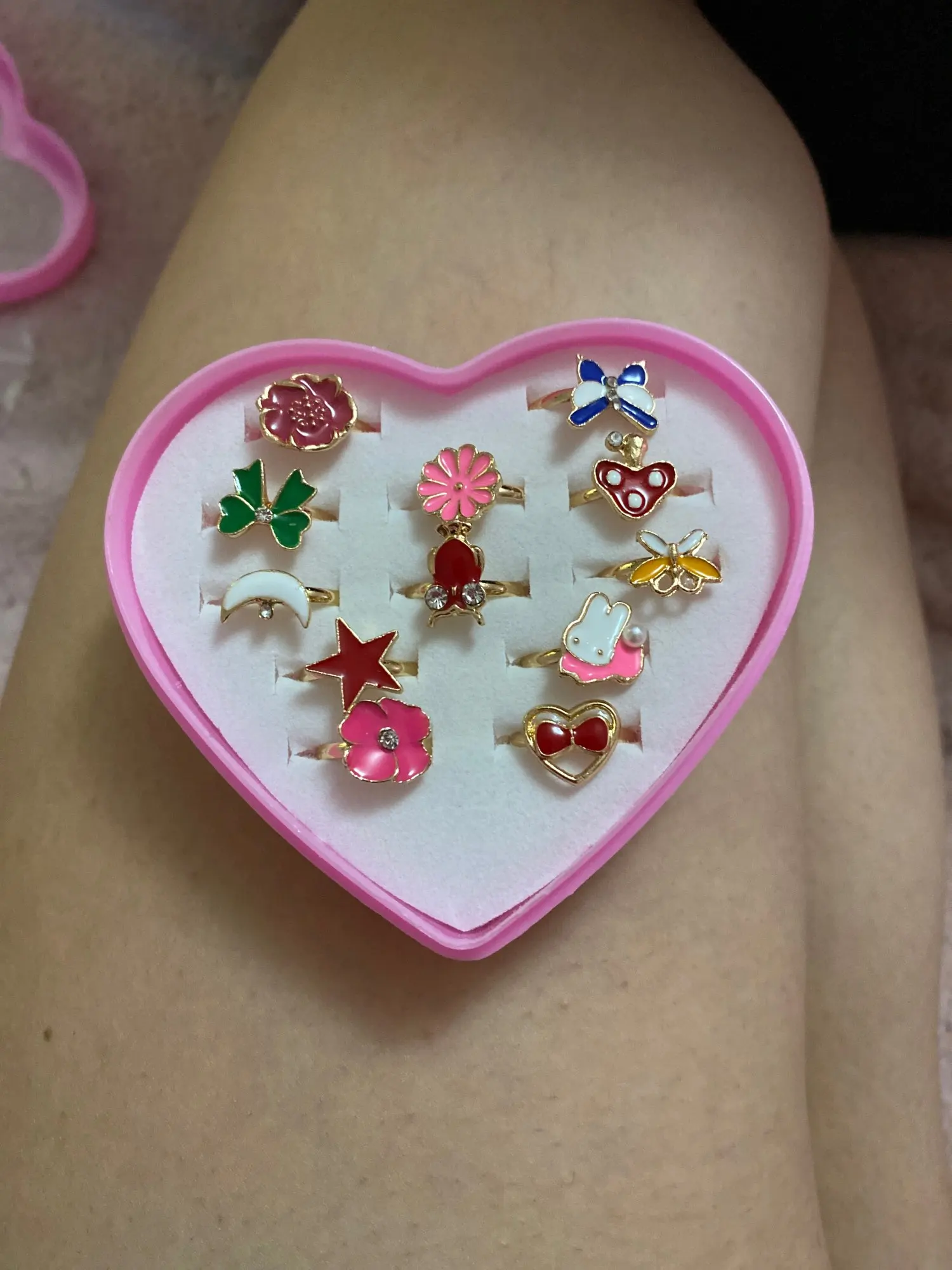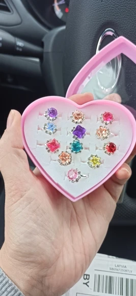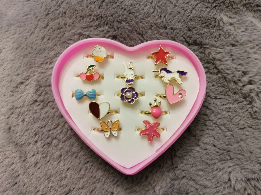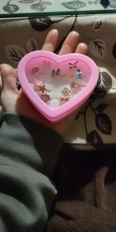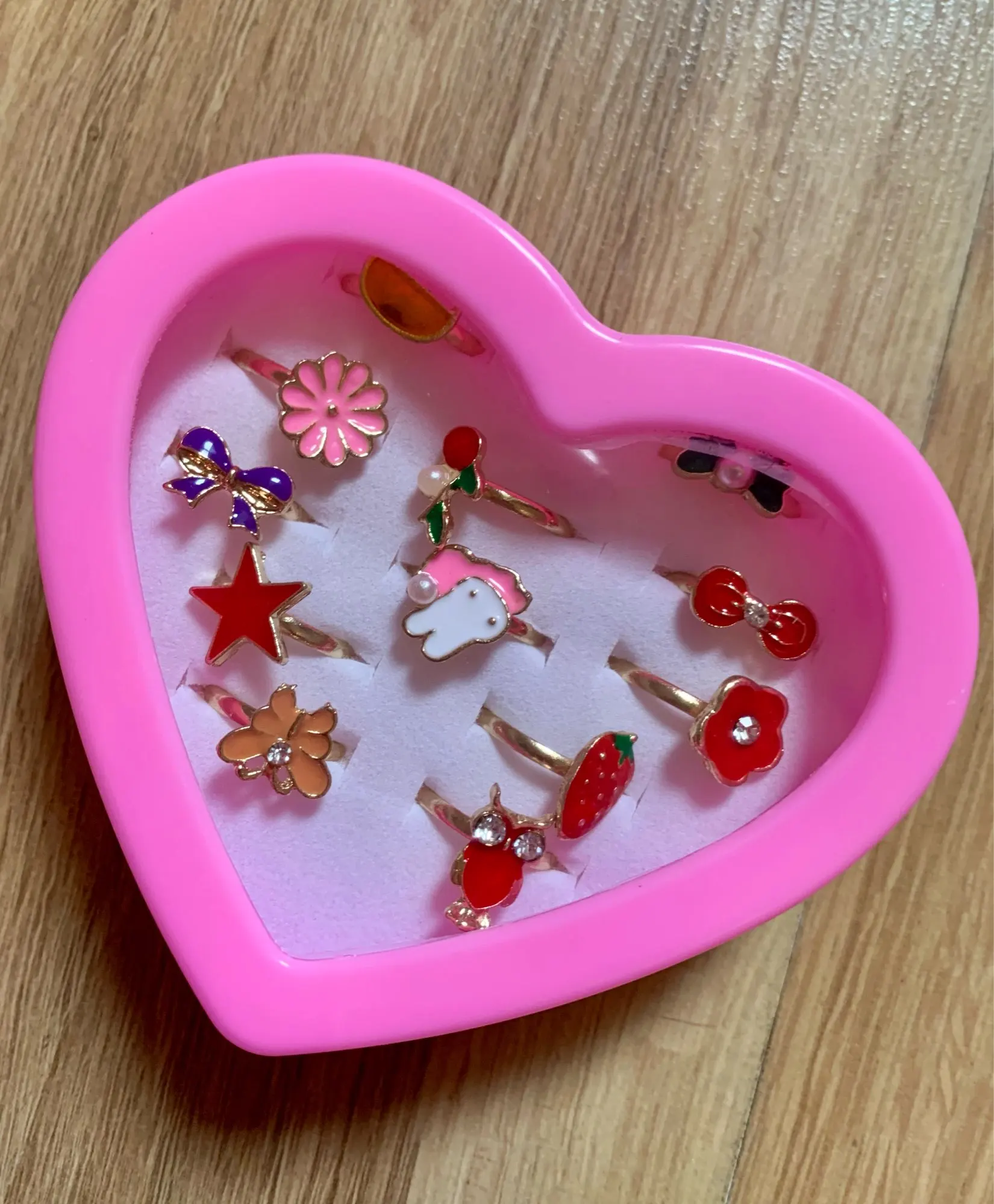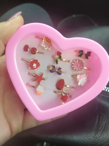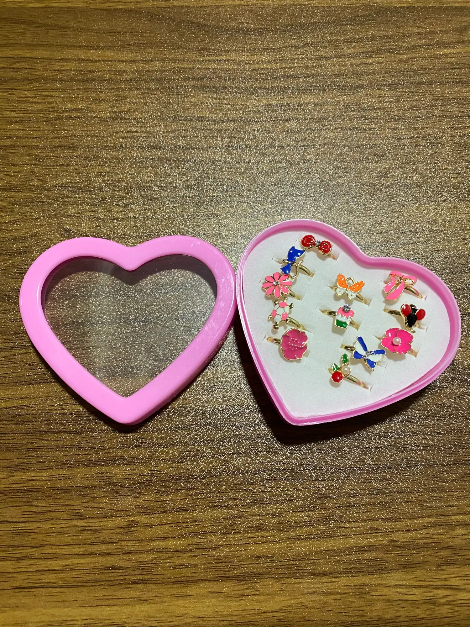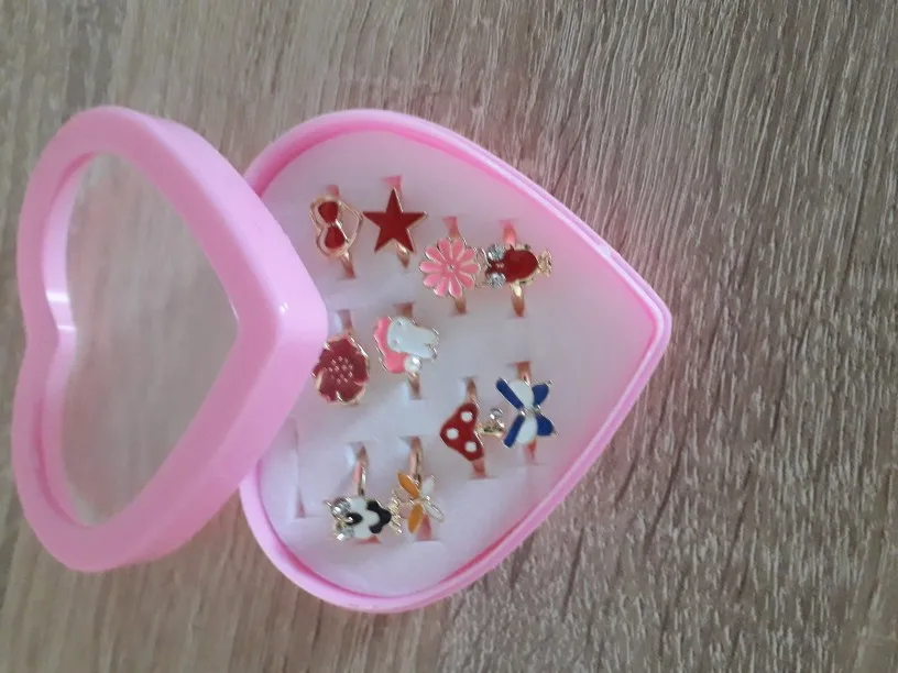 Cute adjustable rings. Shame some of the ornaments were in an angle on the ring. Plastic heart package arrived complete.