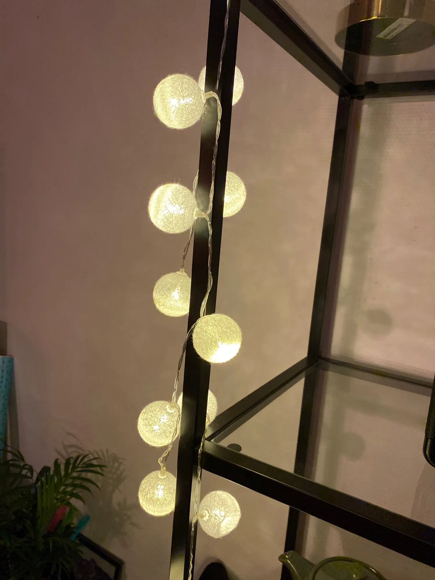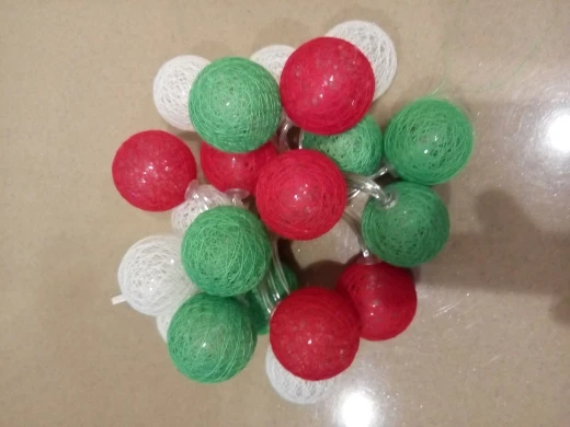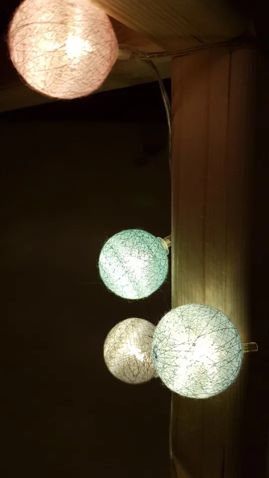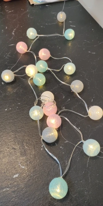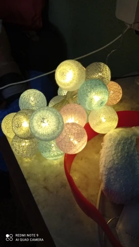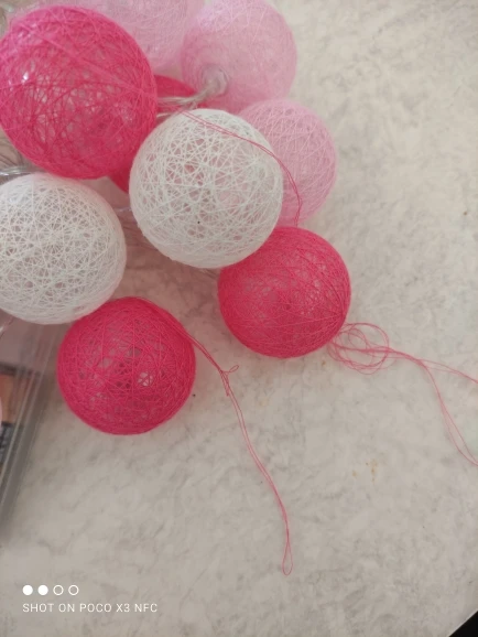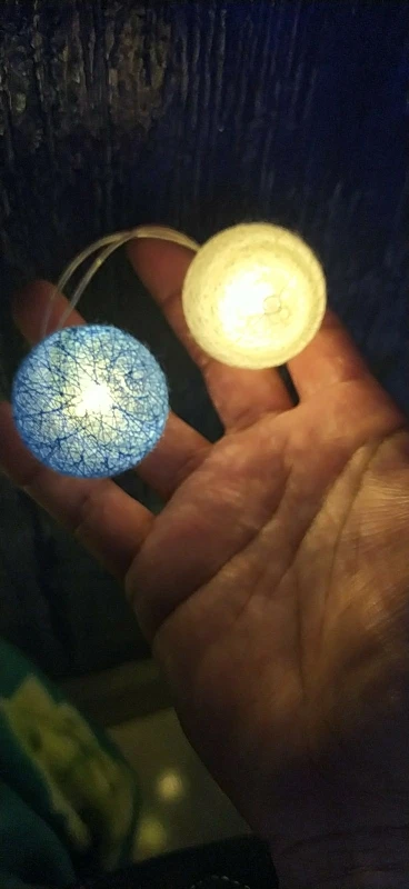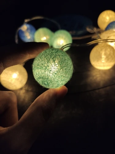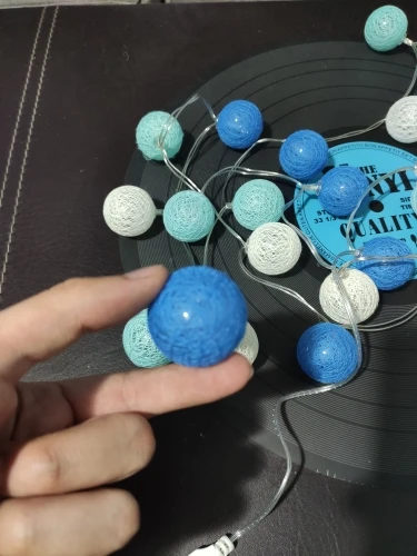 Доставка быстрая, все работает) шарики просто обмотаны самой обычной тонкой нитью, при включении это никак не влияет на свет (а хотелось бы) он жёлтый!