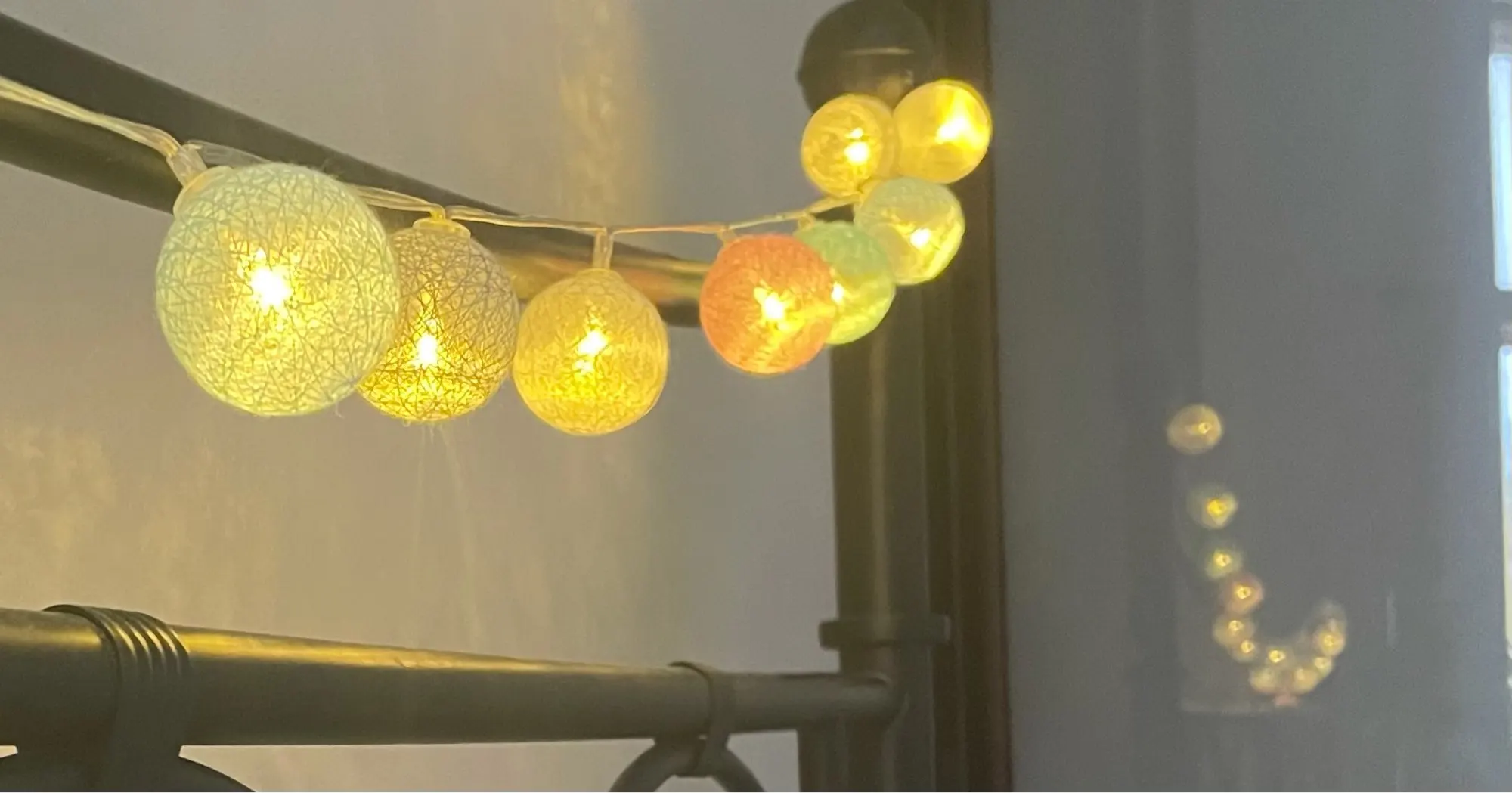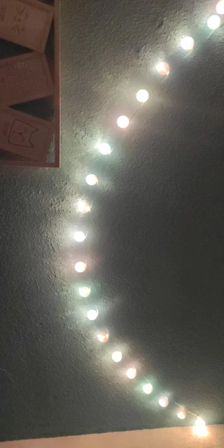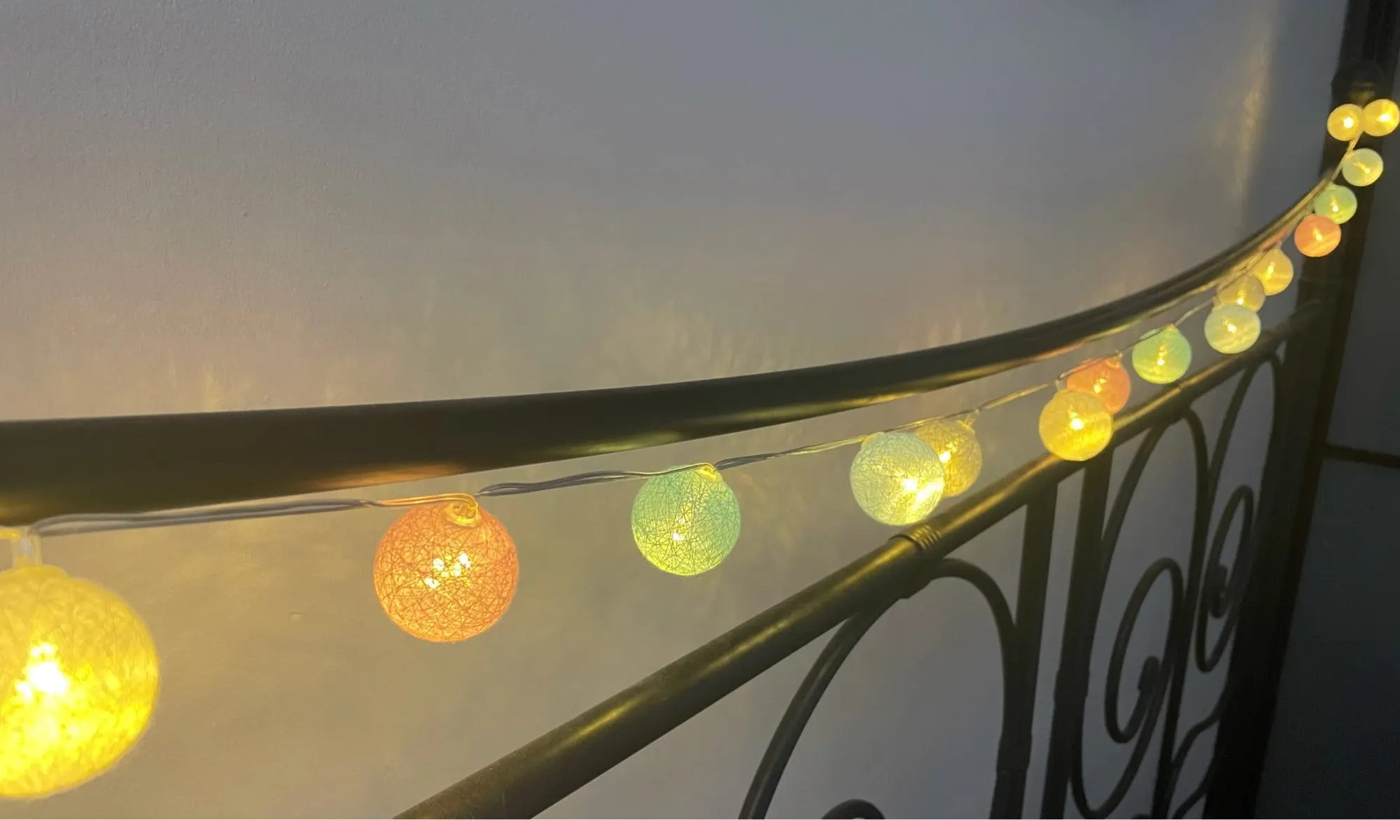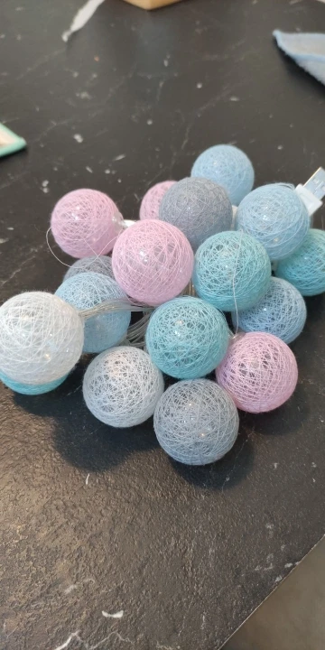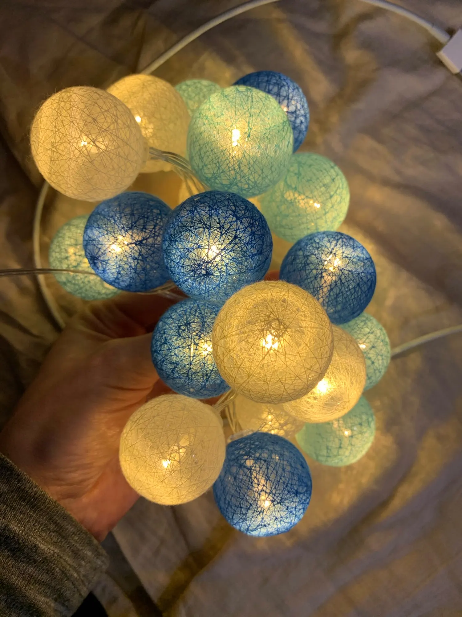 Доставка быстрая, все работает) шарики просто обмотаны самой обычной тонкой нитью, при включении это никак не влияет на свет (а хотелось бы) он жёлтый!