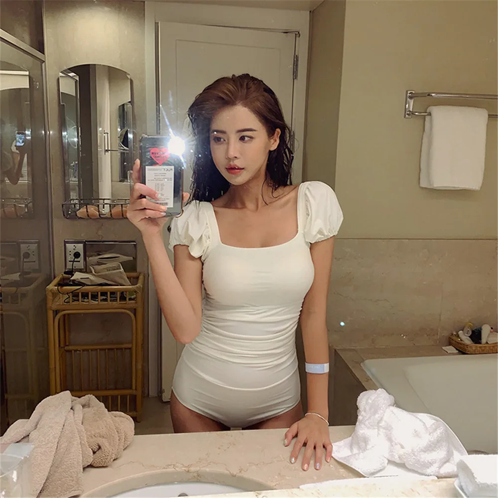 Женский цельный купальный костюм с коротким рукавом, однотонная одежда для плавания, монокини с открытой спиной, купальный костюм пуш-ап, корейский стиль, купальный костюм со складками