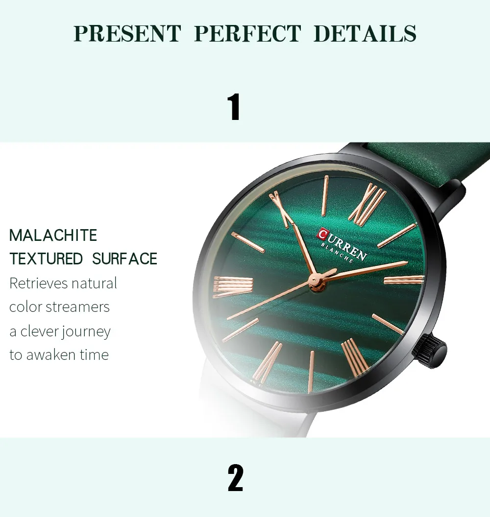 Часы женские кварцевые с кожаным ремешком и малахитовым зеленым ква...