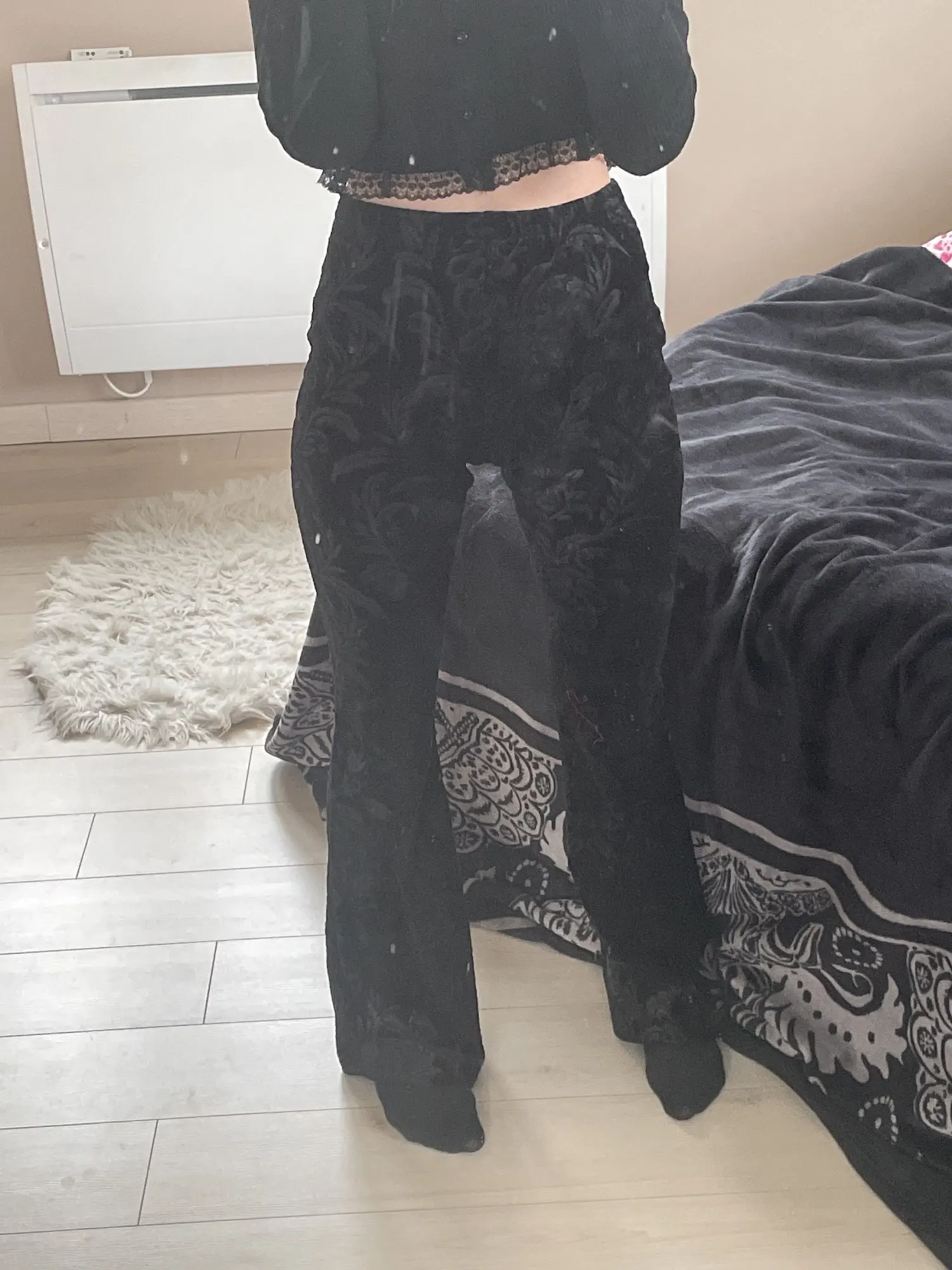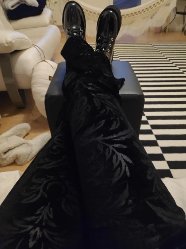 Они как леггинсы с колокольчиком внизу. Бархат красивый и мягкий, а прикосновение довольно приятное. Я счастлив, потому что я высокий, а штаны довольно длинные, идеально подходят для ношения с ботинками. Хорошее соотношение цены и качества. Доставка была очень быстрой, и я получил ее всего за неделю.