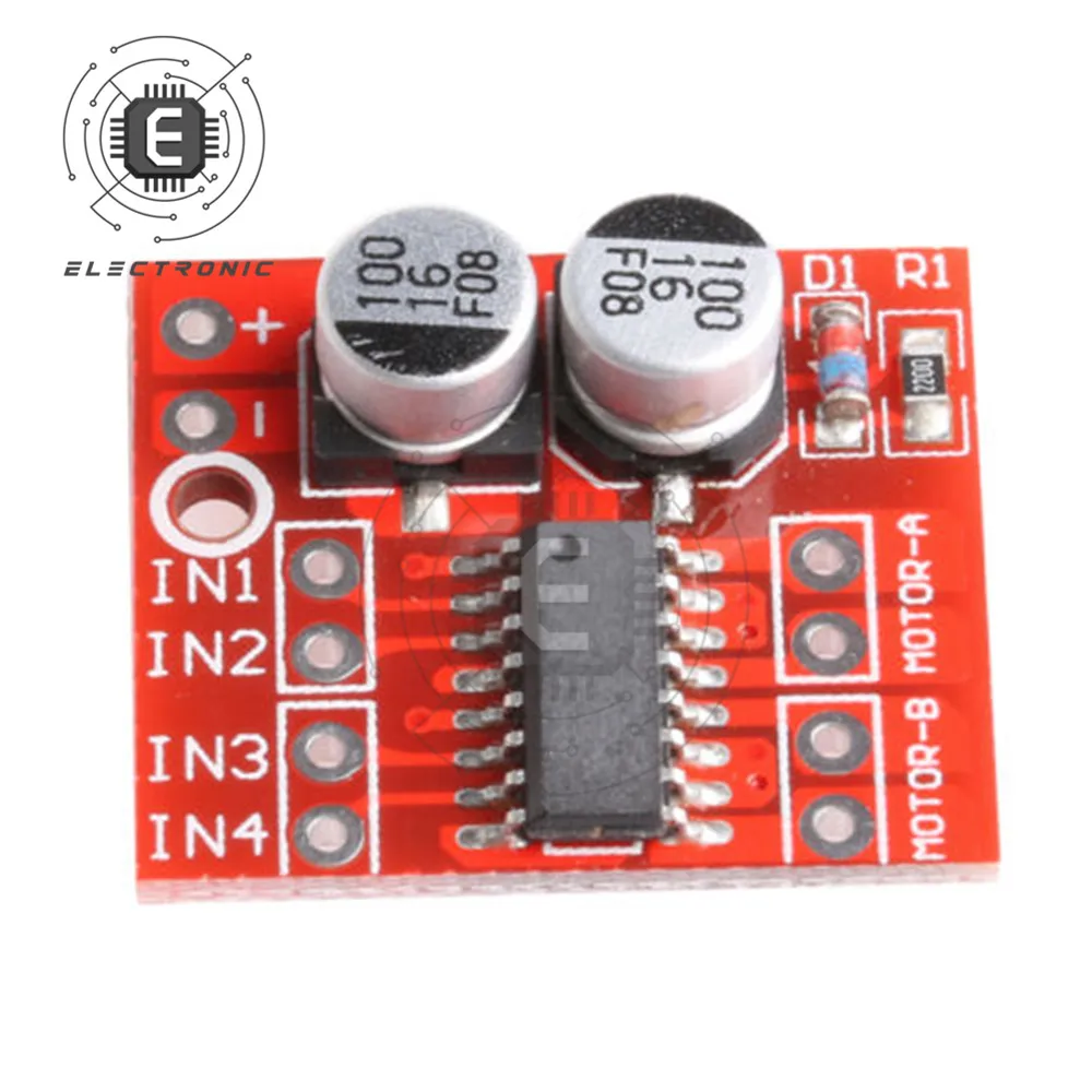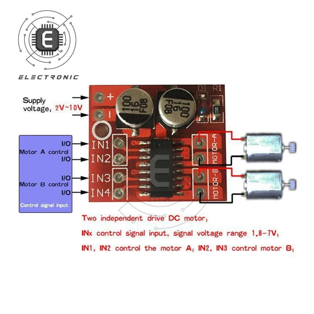 Модуль привода двигателя идеально подходит для использования в интеллектуальных автомобилях на аккумуляторах, игрушечных машинах, роботах. Напряжение питания 2V ~ 10V, может приводить в движение два двигателя постоянного тока или 4-х проводной 2-фазный шаговый моторы, может обеспечить прямое вращение или обратного вращения, скорость вращения можно регулировать. Каждый может обеспечивать постоянный ток 1,5 А, максимальный ток до 2,5 А, ТермоЗащита и может быть автоматически восстановлена.