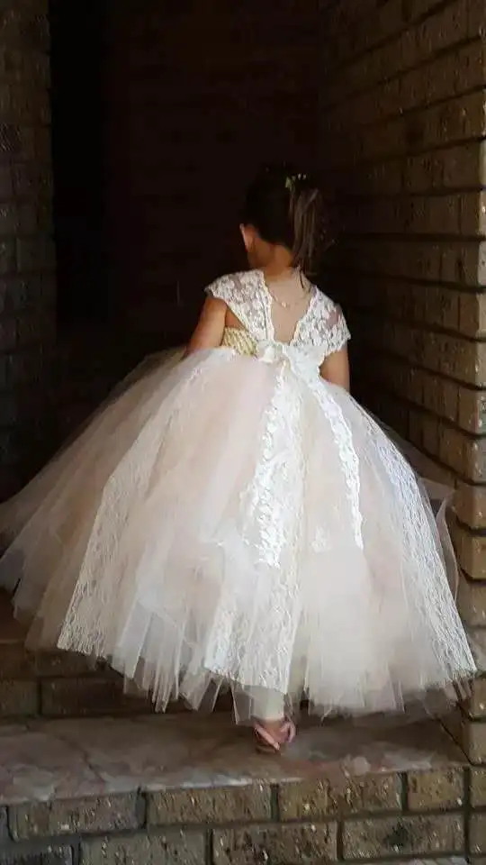 Кружевное платье цвета шампанского для девочек с белыми шифоновыми цветами Стразы и кружевными рукавами на бретельках длиной до щиколотки свадебное платье для маленьких девочек
