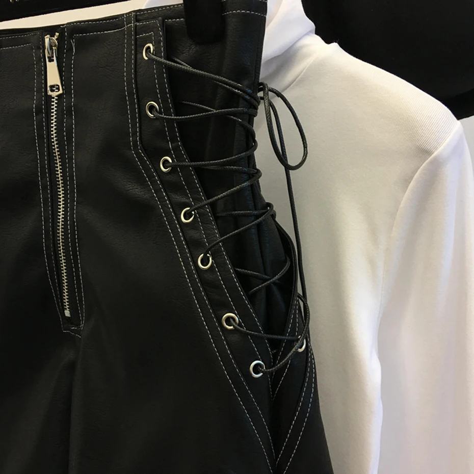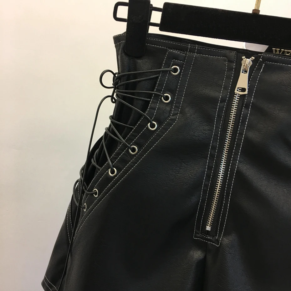 Шорты женские QoerliN на шнуровке, черные, с высокой талией, широкие, из искусственной кожи, 2020
