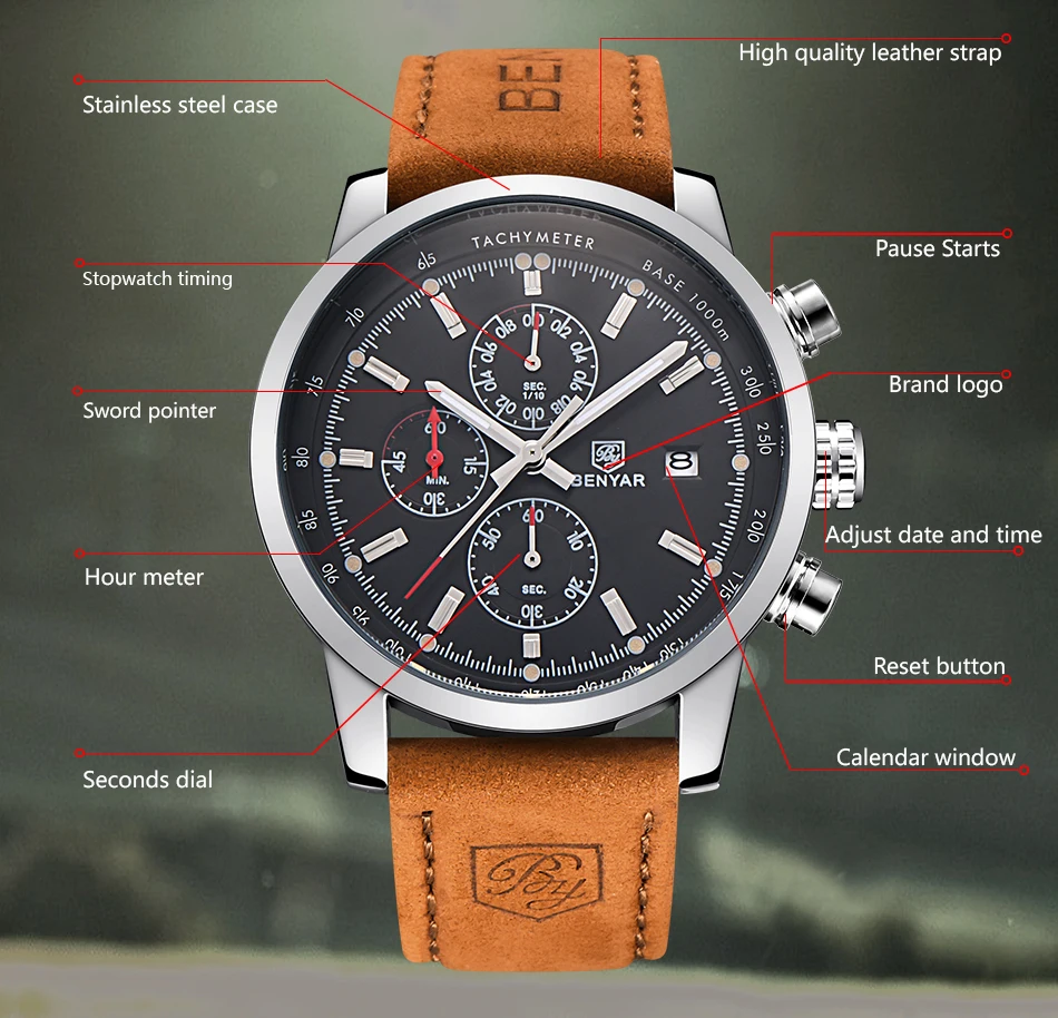 Часы BENYAR Мужские кварцевые с хронографом, Брендовые спортивные Роскошные водонепроницаемые в стиле милитари, с кожаным ремешком