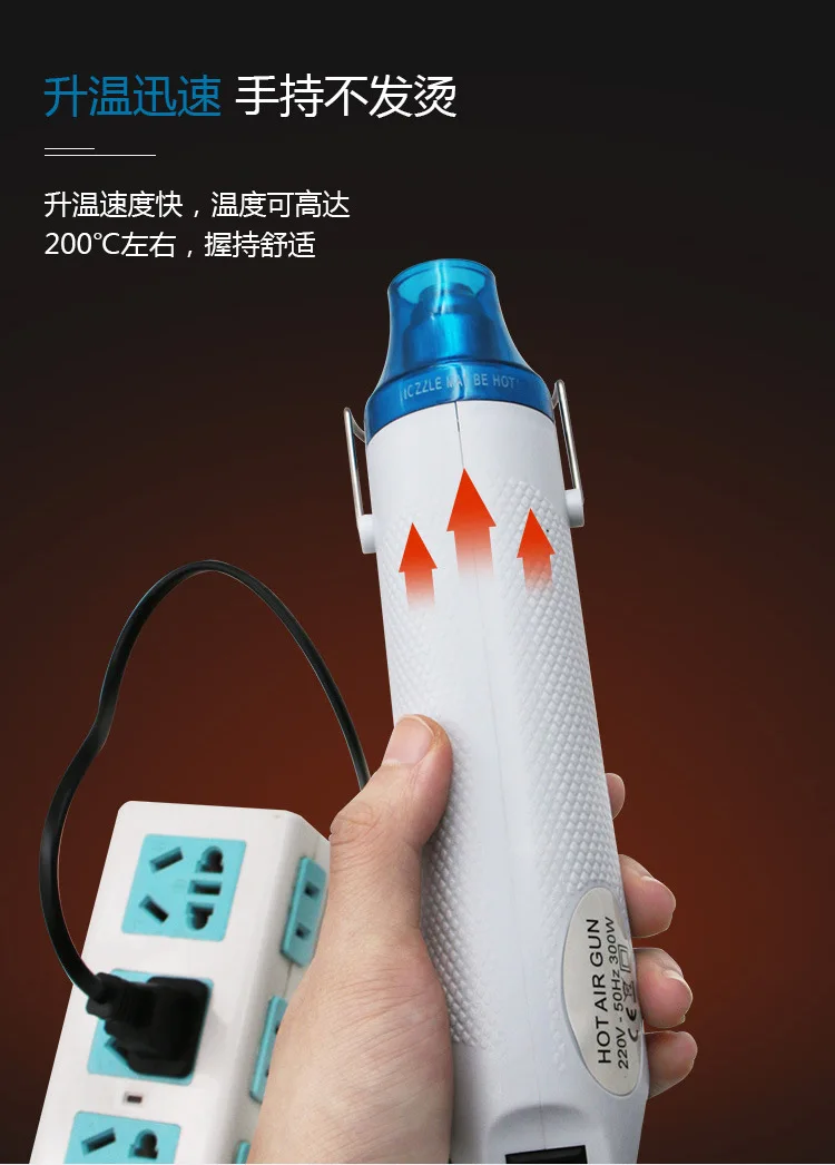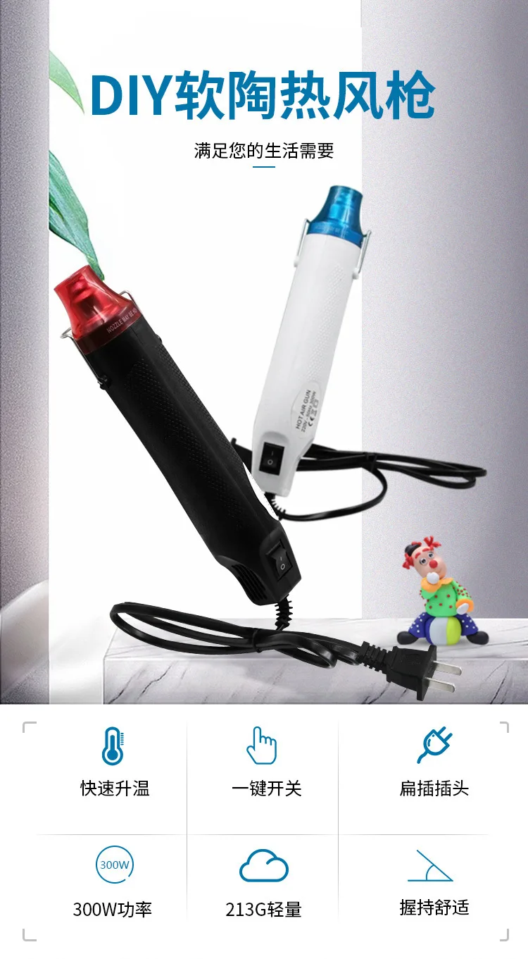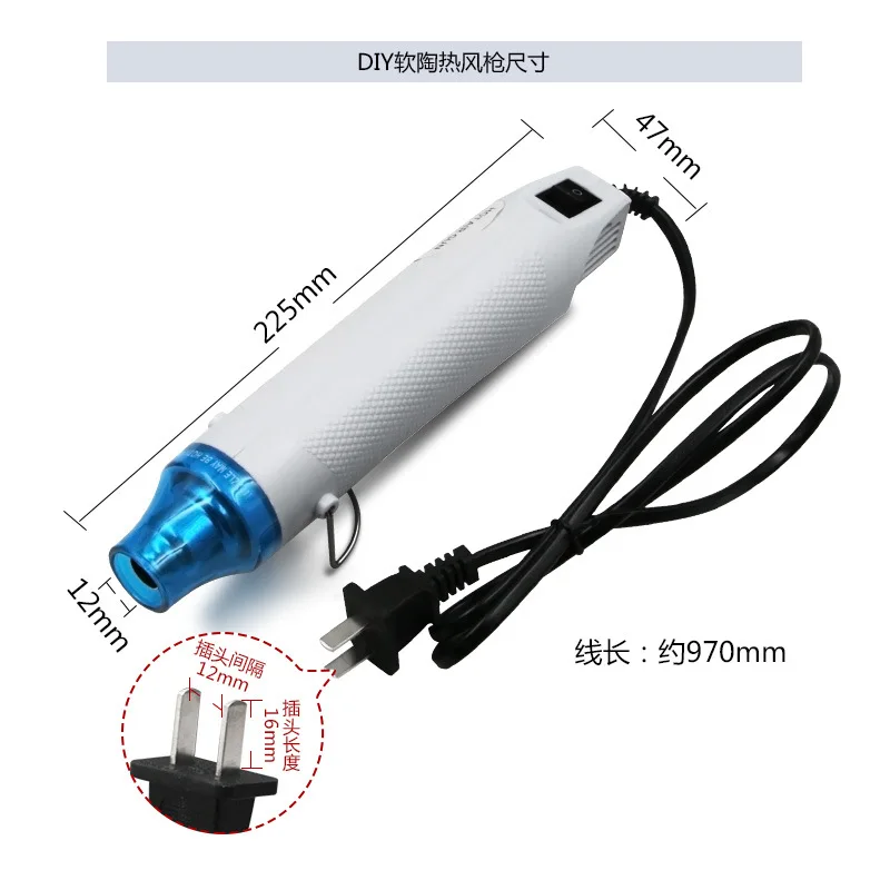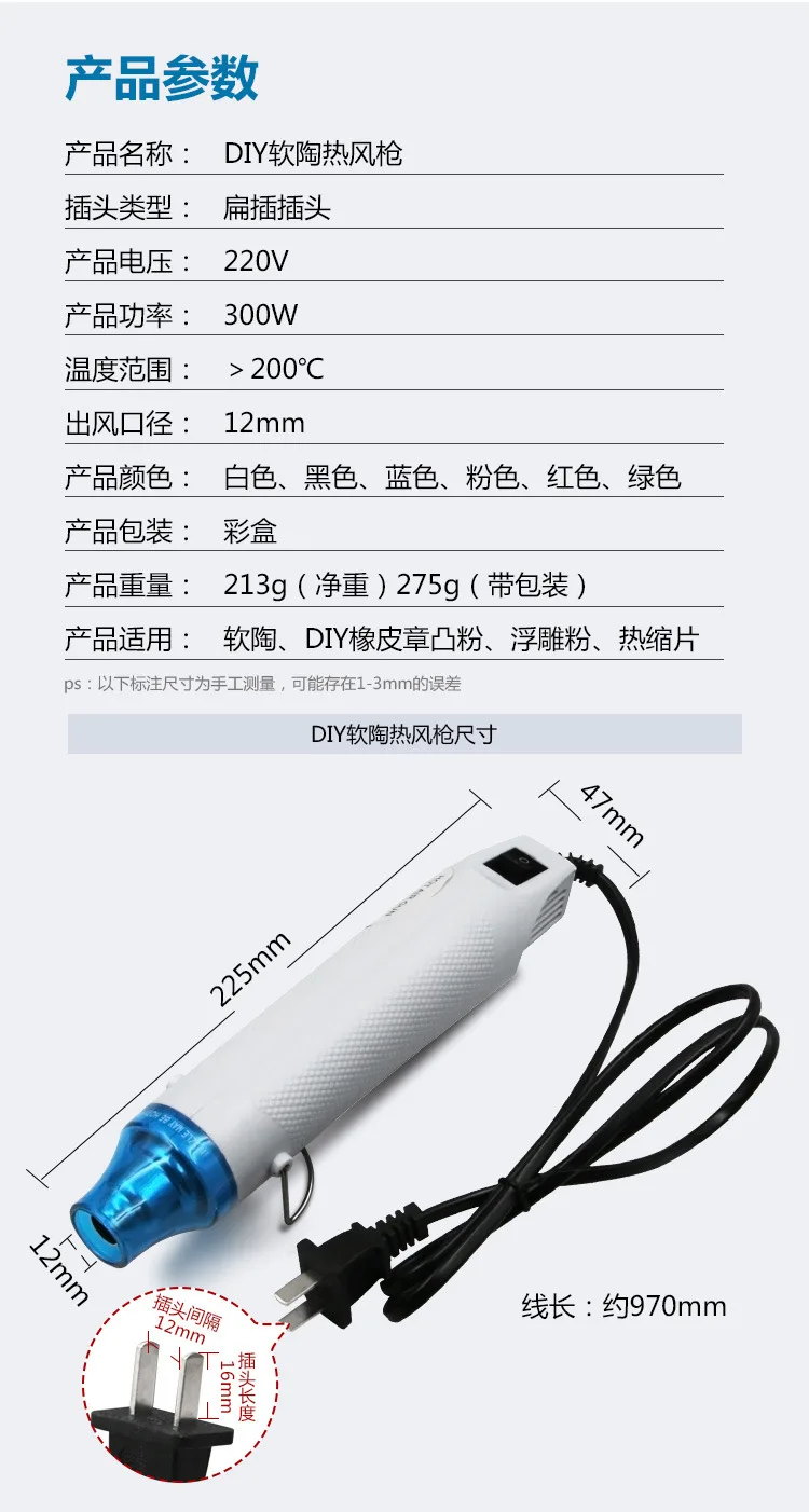 Параметры продукта: Название: сделай сам мягкая глина пистолет горячего воздуха Тип вилки: плоская вилка Напряжение: 220 В Мощность: 300 Вт Диапазон температур: < 200 градусов Диаметр выхода воздуха: 12 мм Размер: см. Изображение (размер измеряется вручную, возможна погрешность 1-3 мм) Вопросы, требующие внимания: 1. Пожалуйста, не используйте пистолет горячего воздуха, чтобы взорвать непосредственно на 90 ° до объекта. 2. Рекомендуемое расстояние между горячим воздушным пистолетом tuyere и нагревательными изделиями составляет 5-6 см. 3. Время одноразового использования пистолета горячего воздуха не должно быть слишком длинным, как правило, 2-3 минуты. Если температура тела поднимается, пожалуйста, выключите пистолет горячего воздуха и подождите охлаждения перед использованием. 4. Температура пистолета горячего воздуха может достигать только около 200 ° и не может использоваться в таких отраслях, как мелкие компоненты микросхем и интегральные схемы микросхем.