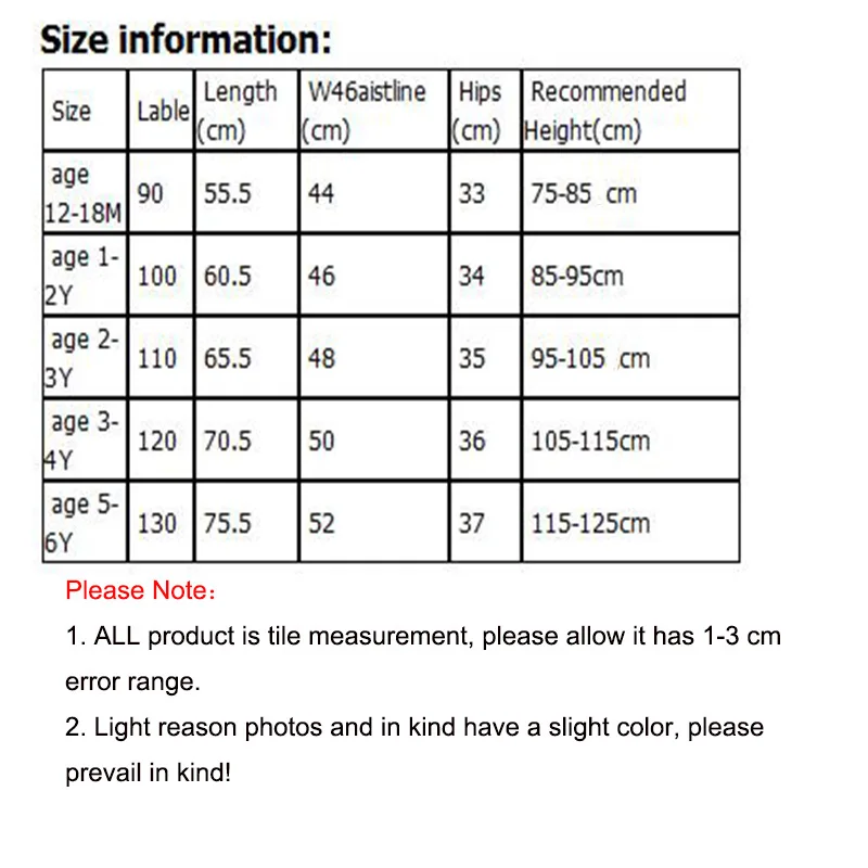 Материал: хлопокСезон: Осень, ЗимаИнформация о размере:РазмерыЛаблеДлина (см)W46aistline (см)Бедра (см)Рекомендуемая высота (см)Возраст 12-18 м9055,5443375-85 смВозраст От 1 до 2 лет10060,5463485-95 смВозраст От 2 до 3 лет11065,5483595-105 смВозраст От 3 до 4 лет12070,55036105-115 смВозраст От 5 до 6 лет13075,55237115-125 смОбратите внимание:1. Все продукты являются измерениями плитки, пожалуйста, учитывайте погрешность в 1-3 см.2. Пожалуйста, при покупке выбирайте размер в соответствии с таблицей размеров. Если вы не понимаете их, пожалуйста, свяжитесь с нами. Сообщите нам вес и рост ваших детей. Мы поможем вам сделать лучший выбор.3. Светильник причина фотографии и в натуральной форме, у вас есть s светильник цвет, просим отнестись к этому с пониманием!