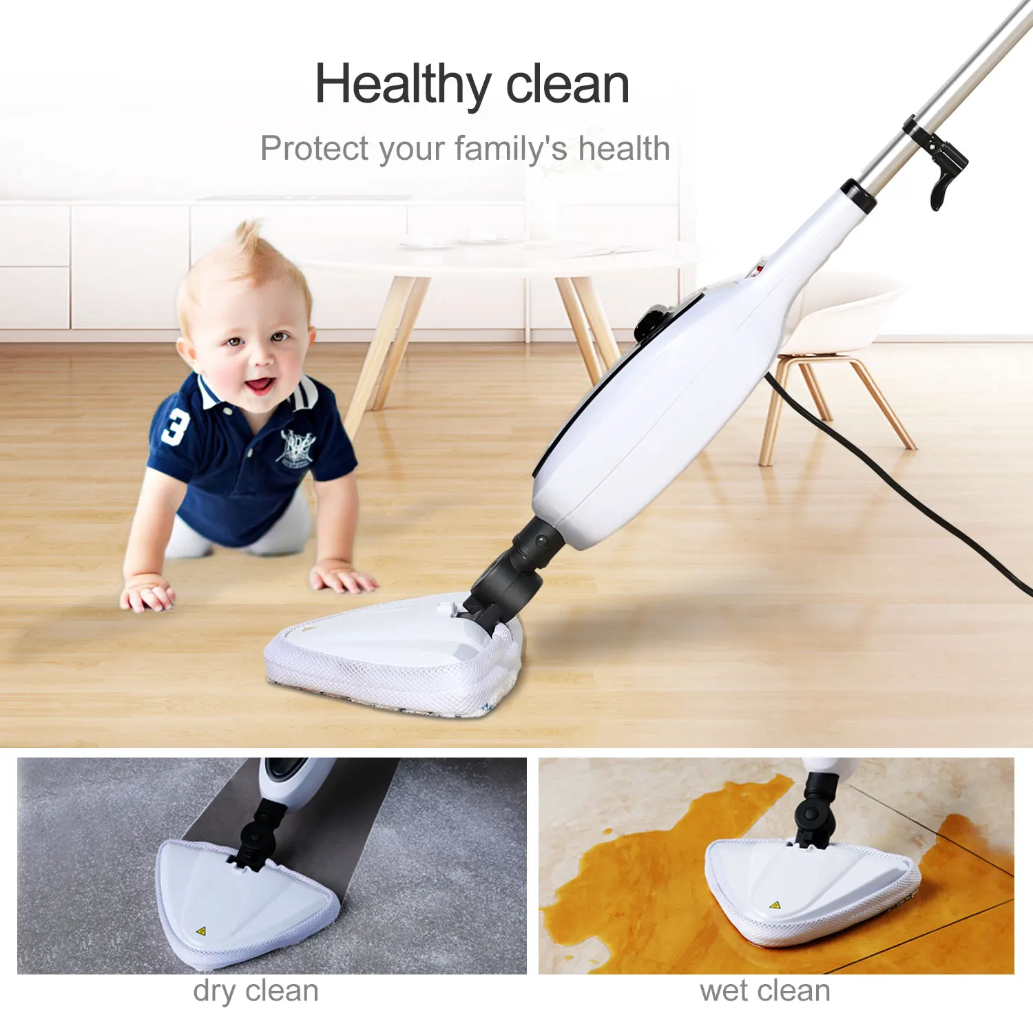 1. Многофункциональный бытовой чистящий инструмент: изделие оснащено несколькими сменными головками с различными функциями, которые можно не только использовать в качестве паровой швабры, но также может использоваться в качестве ручного пароочистителя после удаления съемного полюса.