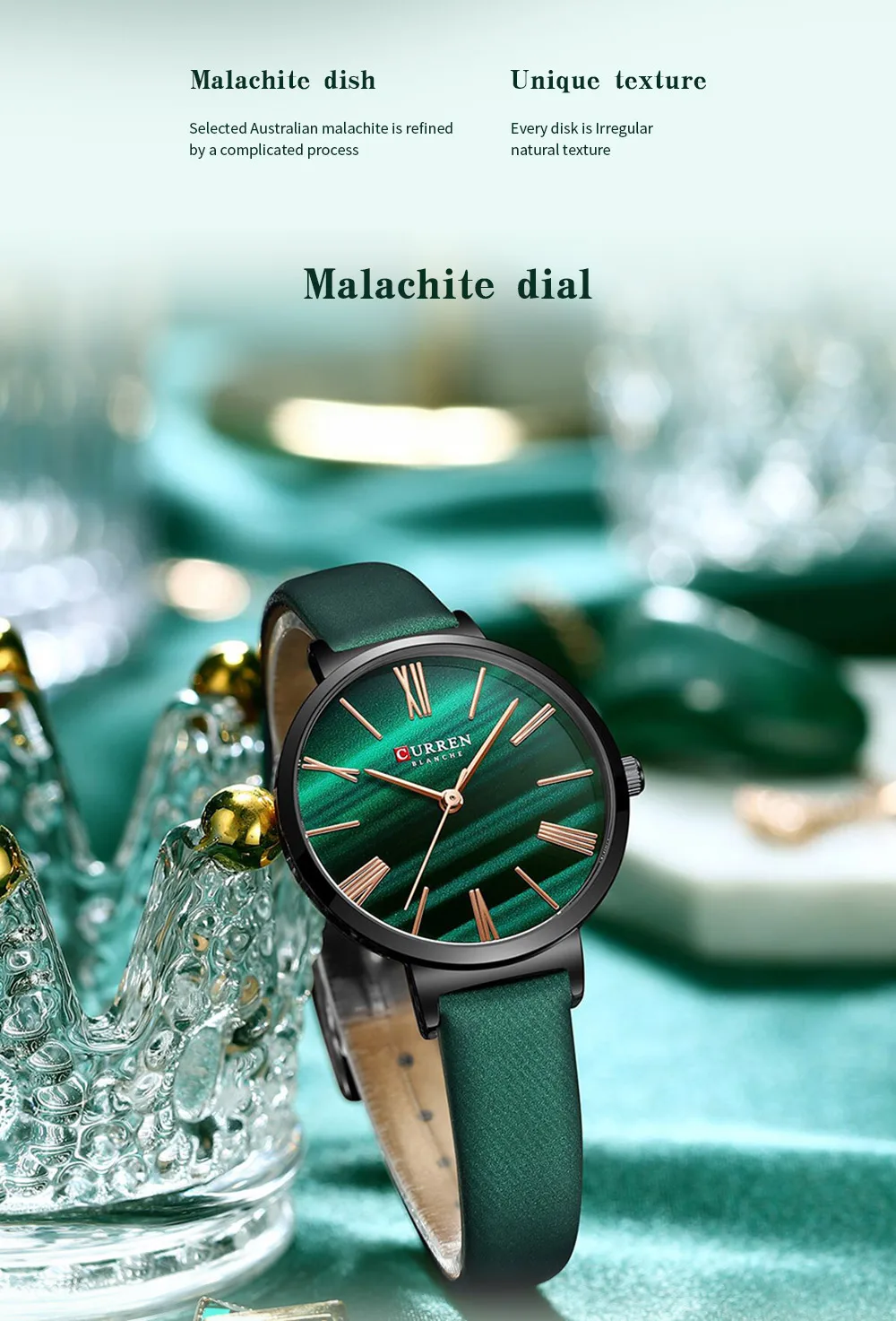 Часы женские кварцевые с кожаным ремешком и малахитовым зеленым ква...