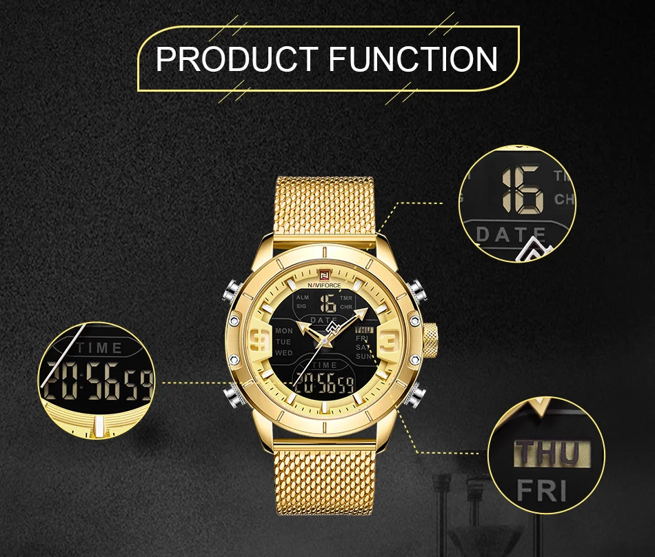 Модель: NAVIFORCE NF9153Механизм: кварцевый + цифровой механизмМужские и мужские Пол: Relogio MasculinoСтиль: Модный, Повседневный, СпортивныйМатериал циферблата: закалённое минеральное стеклоМатериал ремешка: нержавеющая стальТип застежки: застежка-крючокДиаметр циферблата: 45 ммЧехол Толщина: 15 ммДлина ремешка: 245 ммШирина ремешка: 23 ммВес изделия: 159 гХарактеристики: время, водонепроницаемость 30 м, отображение даты недели хронограф.Товары включают: оригинальные часы * 1, гарантийный талон * 1, Инструкция * 1Мы поддерживаем прямую доставку и оптовую продажу