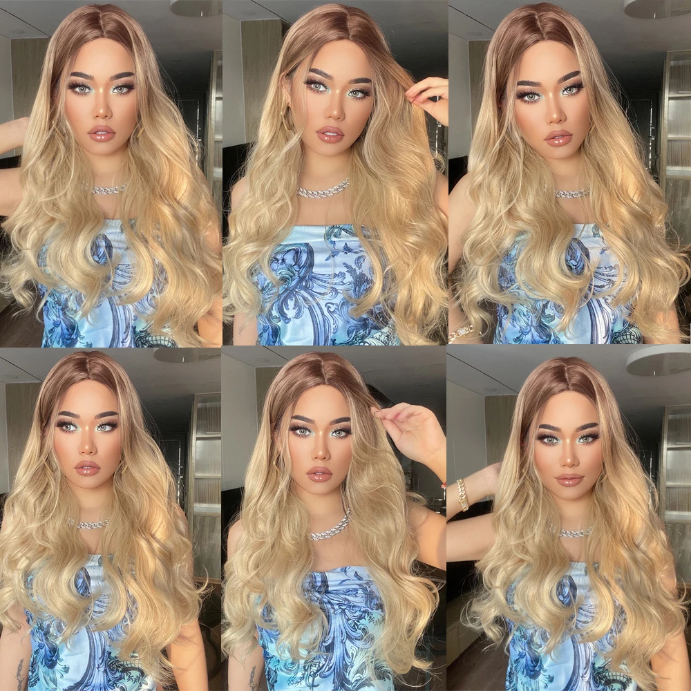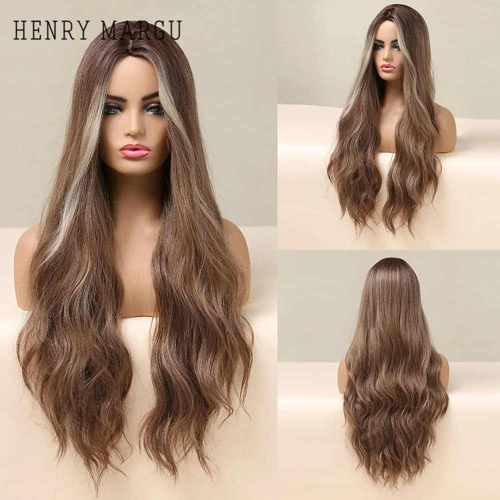 Длинные волнистые синтетические парики henmargu, парик из коричневого и светлого натуральных волос с эффектом омбре для косплевечерние, парик из термостойкого волокна для женщин