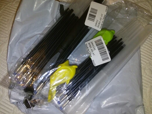 Заказ пришёл довольно быстро, стержни все пишут, но чернила исчезают сами собой через несколько минут. Для школы не подходят.