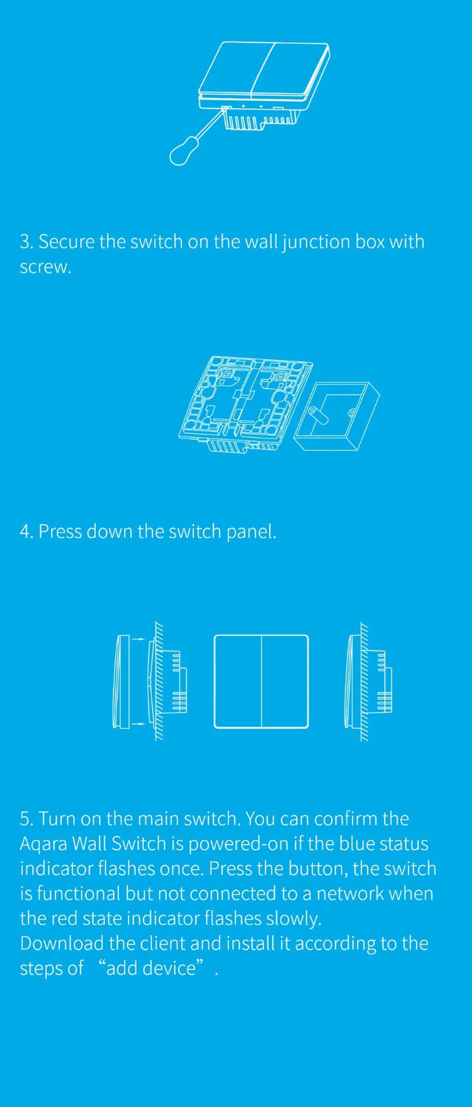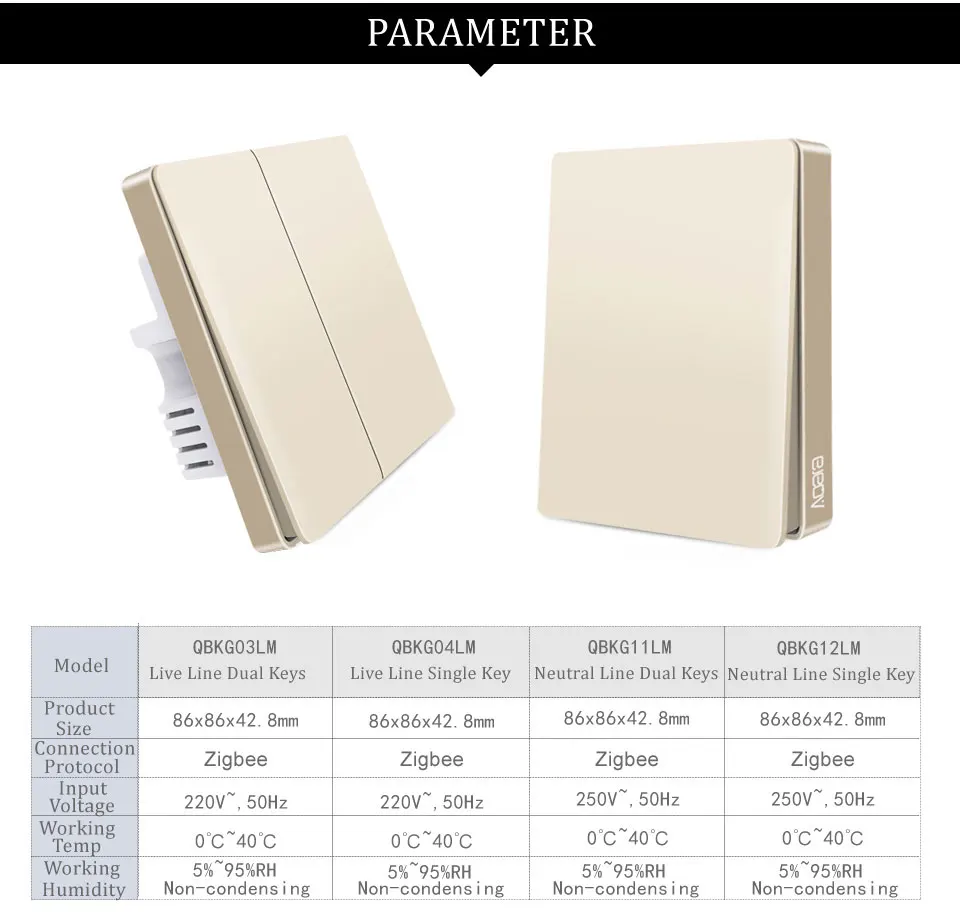 Aqara настенный выключатель беспроводной версииНе может быть проводной, может работать только для смарт-лампы Xiaomi или свет через ZigBeeПортативный, реализовать контроль вездеМожет использоваться в качестве ключевого дверного звонкаЭкстренный вызов SOSФункция защиты и снятияБеспроводной частота: 2,4 ГГц (2400-2483,5 МГц)Беспроводное подключение: ZiGBeeВстроенный аккумулятор CR2032Рабочая температура: -5 - 60 градусов по ЦельсиюРабочая влажность: 5 - 95pctПожалуйста, загрузите приложение «MiHome» в Google Play или APP Store
