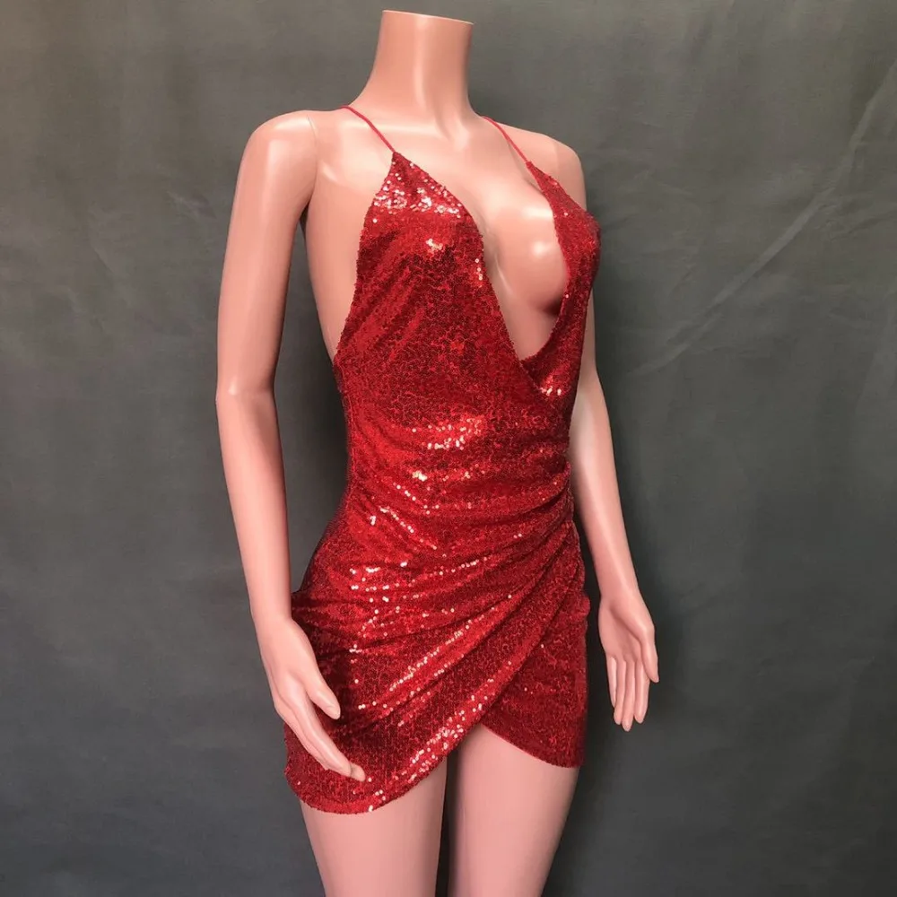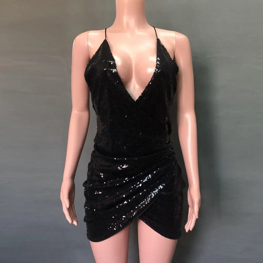 WJFZQM мини блестящее сексуальное платье с запахом Глубокий V-образ...