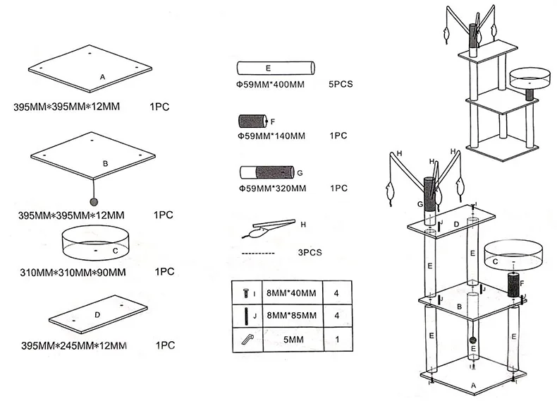 Génial, excellente opportunité,que l'achat de ce griffoir acheté à -60€, Envoyé rapidement,dans son emballage,un carton épais,anti-choc.Notice de montage fourni,avec dessins explicatifs, même si en chinois,on comprend.Poteaux et planches,qui semblent solides,du moins durant le montage.Transaction vendeur réactif et sérieux,que demander de plus.Client satisfait.