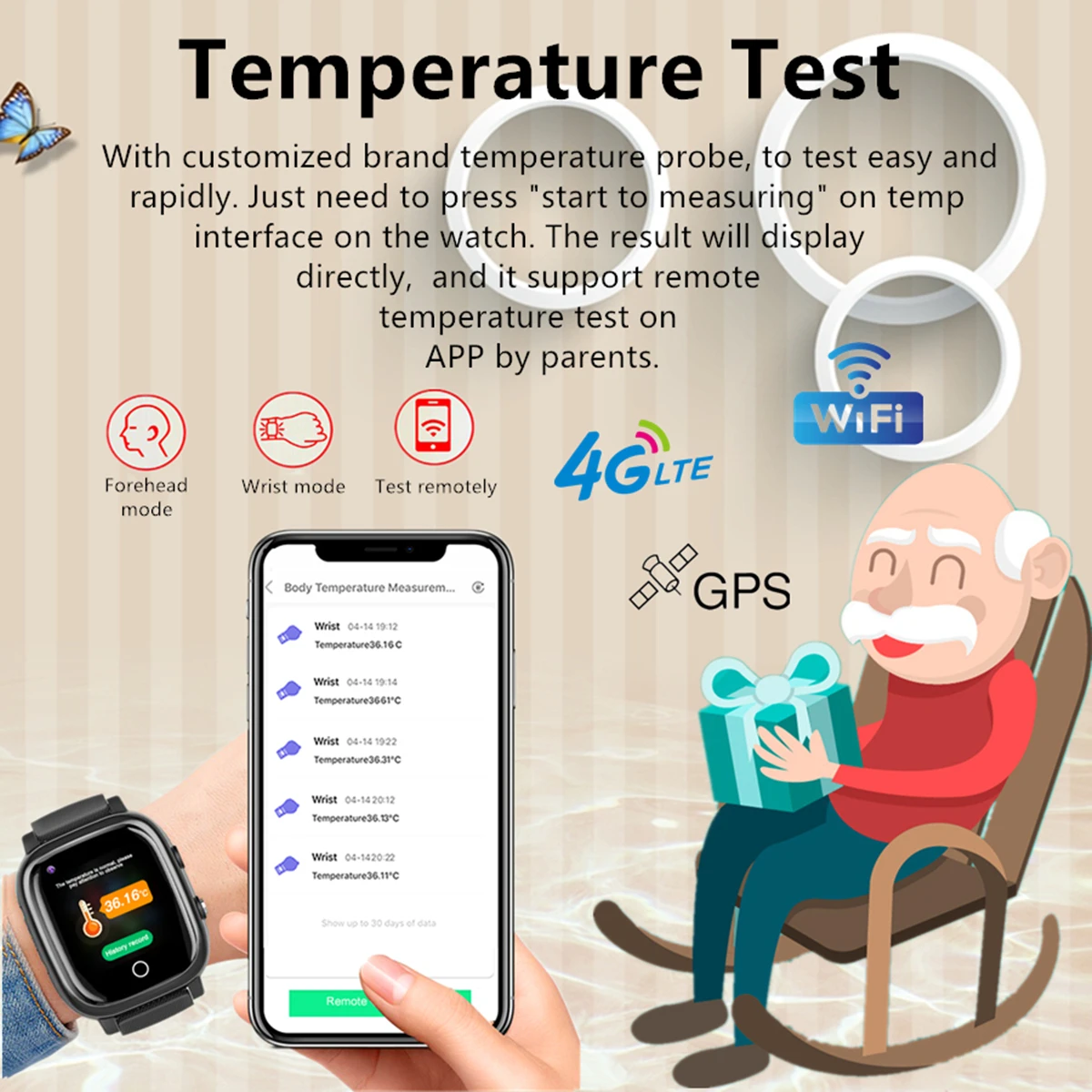 Сенсорный экран: ДаМатериал ремешка: силиконЧип: SP9820EЕмкость аккумулятора: 680MAВремя зарядки: 2 чРазрешение дисплея: 240*240Размер экрана: 1,3 iPS полный обзорКамера: 30 ВтВремя работы: 72 часаПамять запуска: 512 МбПамять фюзеляжа: 512 МбВодонепроницаемость: IP67 (пожалуйста, не используйте его в горячей/соленой воде, горячей душе)Поддержка сети: 4G WCDMA GMSРадиация: меньше, чем мобильные телефоны, международные стандарты, не повлияли на тело человекаМестоположение: GPS + WIFI + LBSФункция:Пульс, мониторинг артериального давления и кислорода в крови, проверка температуры тела, удаленный монитор, телефонная книга, гео-забор, вызов sos, телефонные звонки, удаленное отключение питания, камера, альбом, часы с будильником, светильник-вспышка, удаленное фотографирование и Съемка фотографий, голосовое общение, видеозвонки, сменная тема дисплея, запись