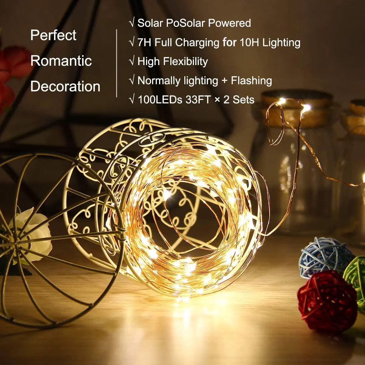 Особенности:[Сказочный струнный светильник на солнечной энергии s] -струнный светильник с подвижной медной проволокой 98/66/33 футов и светящимися светодиодами 300/200/100, с устойчивым углом обзора 360 градусов они освещают в каждом направлении. Идеально подходит для украшения вашего сада, патио, ворот, двора, свадьбы, вечерние и т. Д.[Высококачественные медные провода]-наш медный провод очень тонкий и гибкий, а солнечные медные провода легко сгибаются и образуются вокруг растений, знаков, мебели и почти всего остального. В то же время с низким тепловыделением уровнем выбросов светодиодный ламп, светодиодный гирлянды не будет перегреваться при смазывании формы несколько часов.[8 режимов освещения для создания веселья]-великолепные Режимы освещения, включая комбинацию, мигающие светлячки, волны, выцветание, погоня/мигание, медленно выцветание, мерцание/мигание и постоянное включение, которые могут создать различные атмосферы для вашей жизни.[Легко установить] гибкая медная проводка может легко построить нужные формы; Оберните вокруг стволов деревьев или беседок; В темноте провод тускнеет, оставляя только яркие огни.[Водонепроницаемость]-и струнные лампы, и солнечные панели являются водонепроницаемыми IP65. Не беспокойтесь использовать их в дождь.Характеристики:Цвет: белый/теплый белый/Разноцветный/синий/фиолетовый/розовыйМощность: СолнечнаяДлина: 33 футов/66 футов/98 футовСветодиодный Кол-во: 100/200/300 светодиодный sНапряжение солнечной панели: 2 вВремя работы: более 8 часов после полной зарядкиПосылка включает:1 * Солнечный струнный светильник1 * солнечная панель
