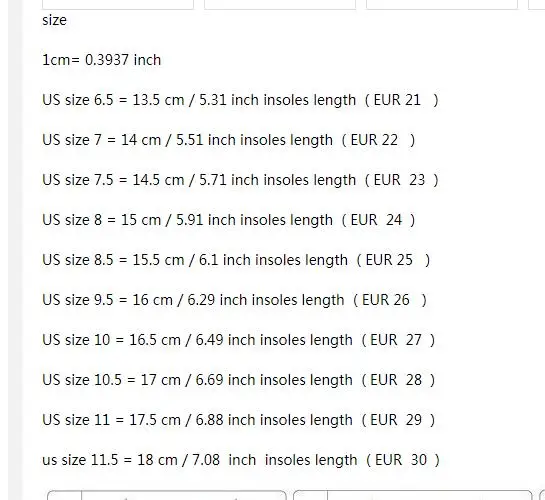 Размер 1 см = 0,3937 дюйма Американский размер 6,5 = 13,5 см/5,31 дюйма, длина стельки (21 евро) Американский размер 7 = 14 см/5,51 дюйма, длина стельки (22 евро) Американский размер 7,5 = 14,5 см/5,71 дюйма, длина стельки (23 евро) Американский Размер 8 = 15 см/5,91 дюйма, длина стельки (24 евро) Американский размер 8,5 = 15,5 см/6,1 дюйма, длина стельки (25 евро) Размер США 9,5 = 16 см/6,29 дюйма длина стельки (26 евро) Американский размер 10 = 16,5 см/6,49 дюйма, длина стельки (27 евро) Размер США 10,5 = 17 см/6,69 дюйма длина стельки (28 евро) Американский размер 11 = 17,5 см/6,88 дюйма, длина стельки (29 евро) Размер США 11,5 = 18 см/7,08 дюйма длина стельки (30 евро)