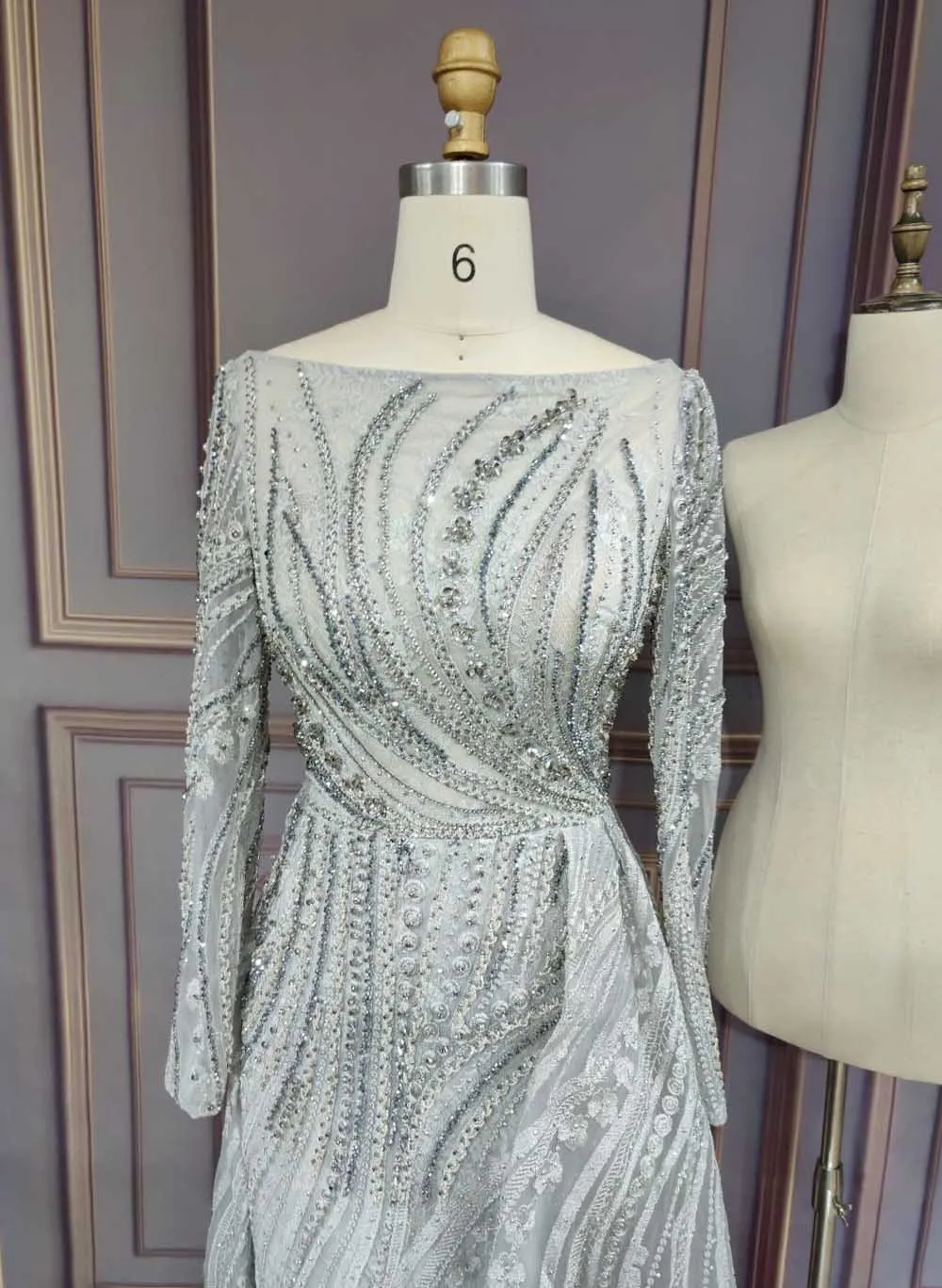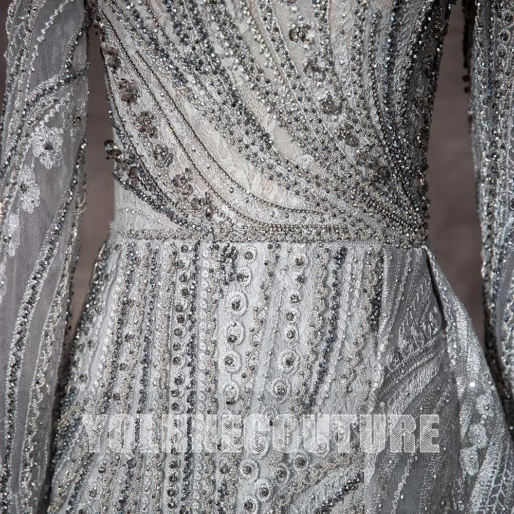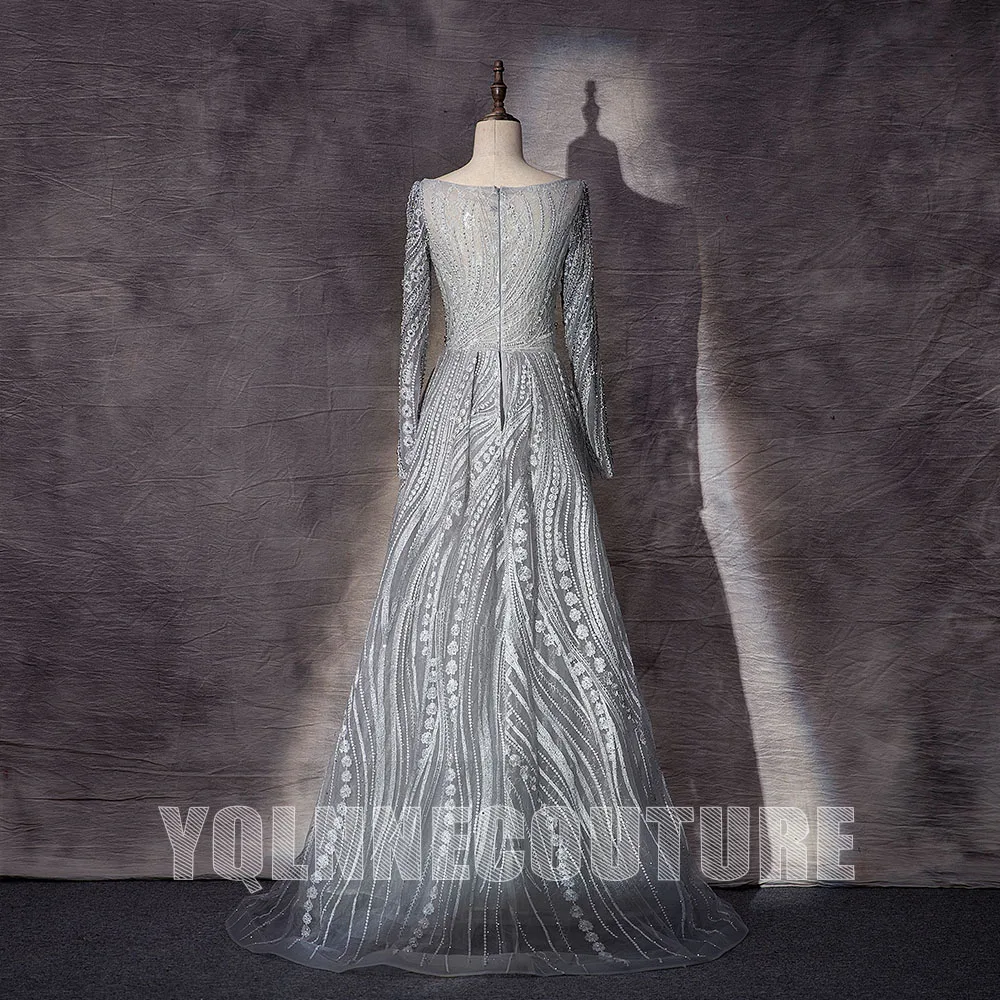 Новые серые кружевные Вышитые мусульманские Вечерние платья с длинным рукавом и вырезом лодочкой и кристаллами официальное с силуэтом "Русалка" и вышивкой бисером платья для женщин YQLNNE