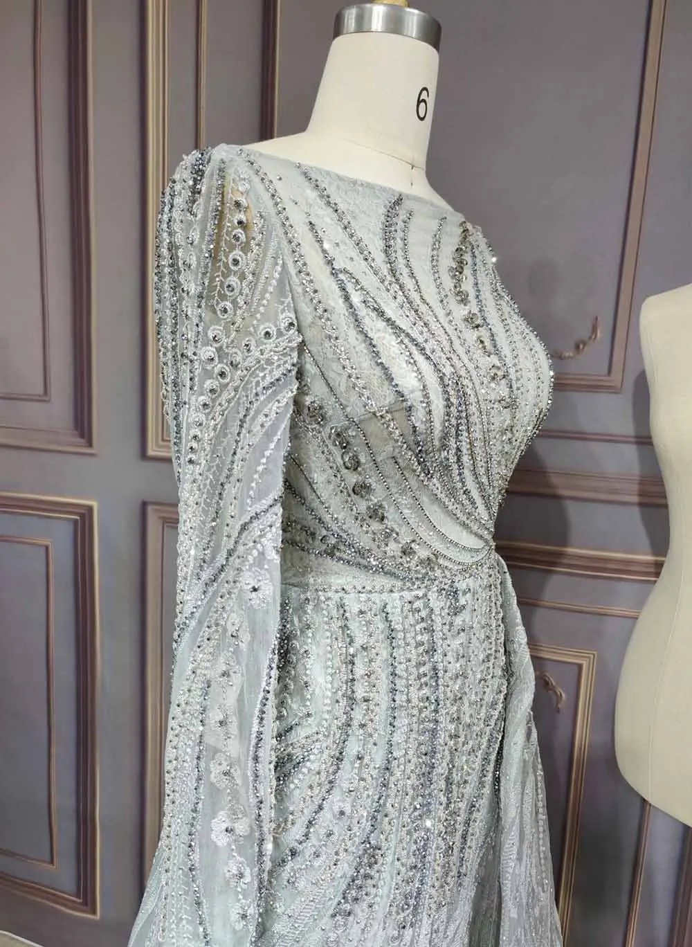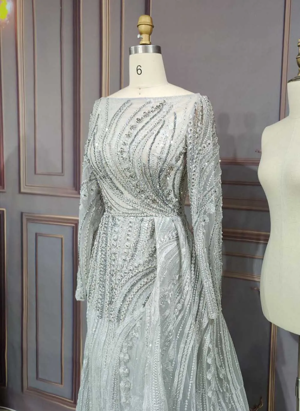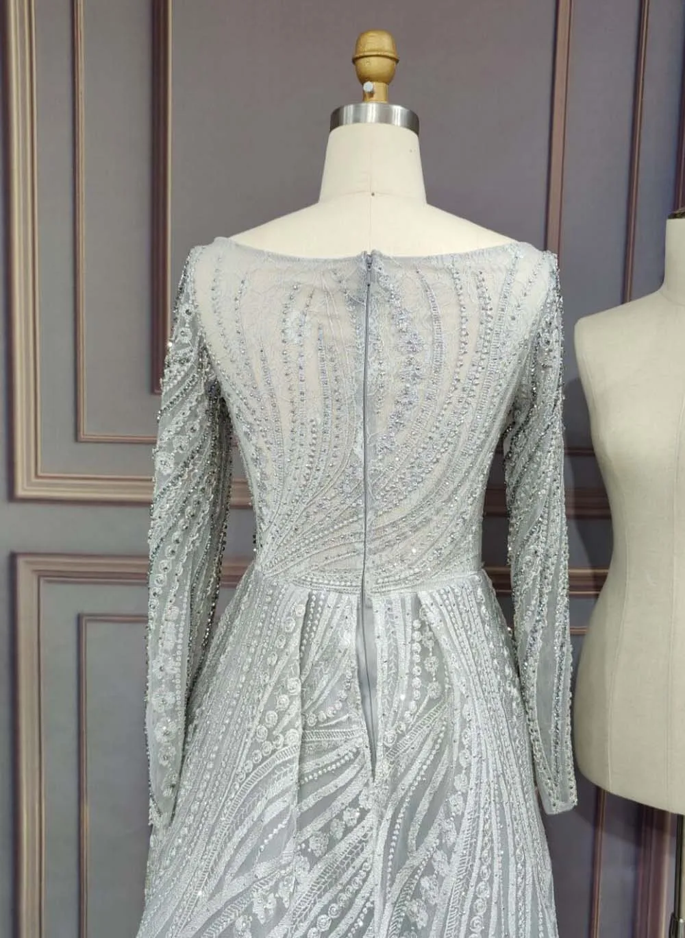 Новые серые кружевные Вышитые мусульманские Вечерние платья с длинным рукавом и вырезом лодочкой и кристаллами официальное с силуэтом "Русалка" и вышивкой бисером платья для женщин YQLNNE