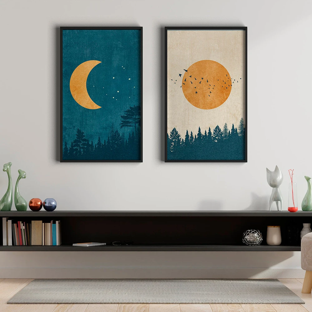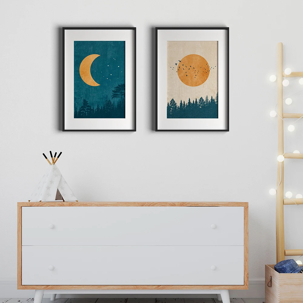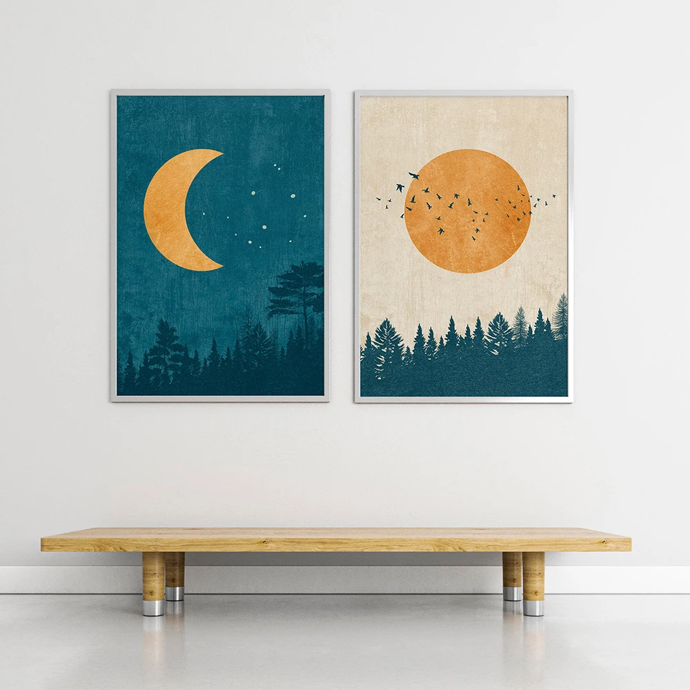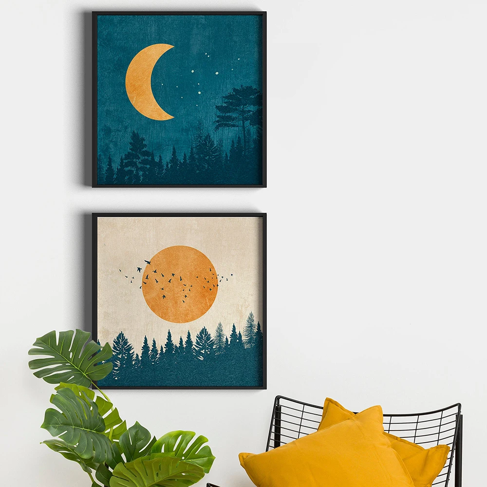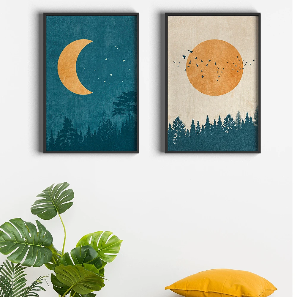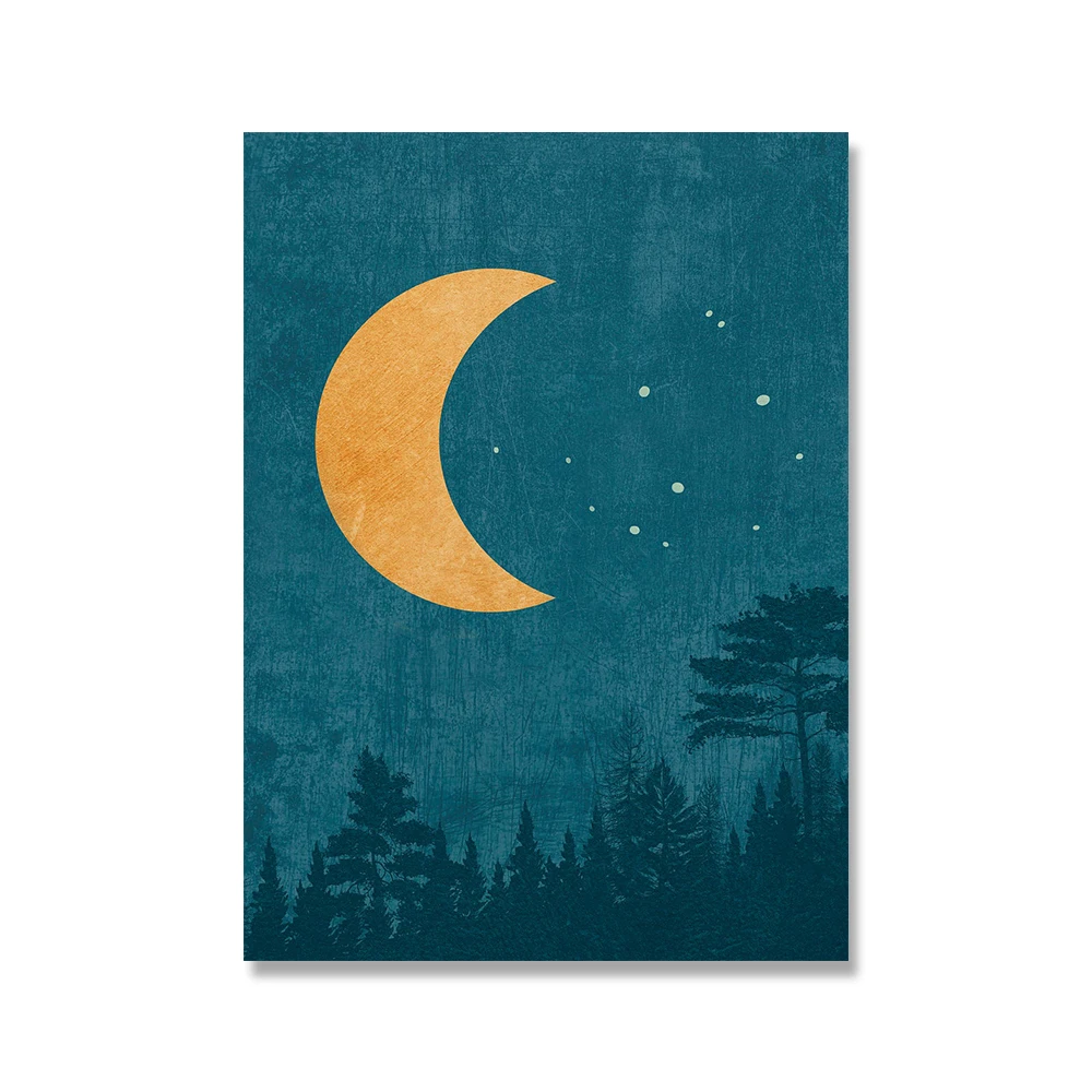 Абстрактные картины с пейзажем в стиле бохо Луна постеры "солнце" и принты винтажные настенные картины скандинавский Лес холст для украшения спальни