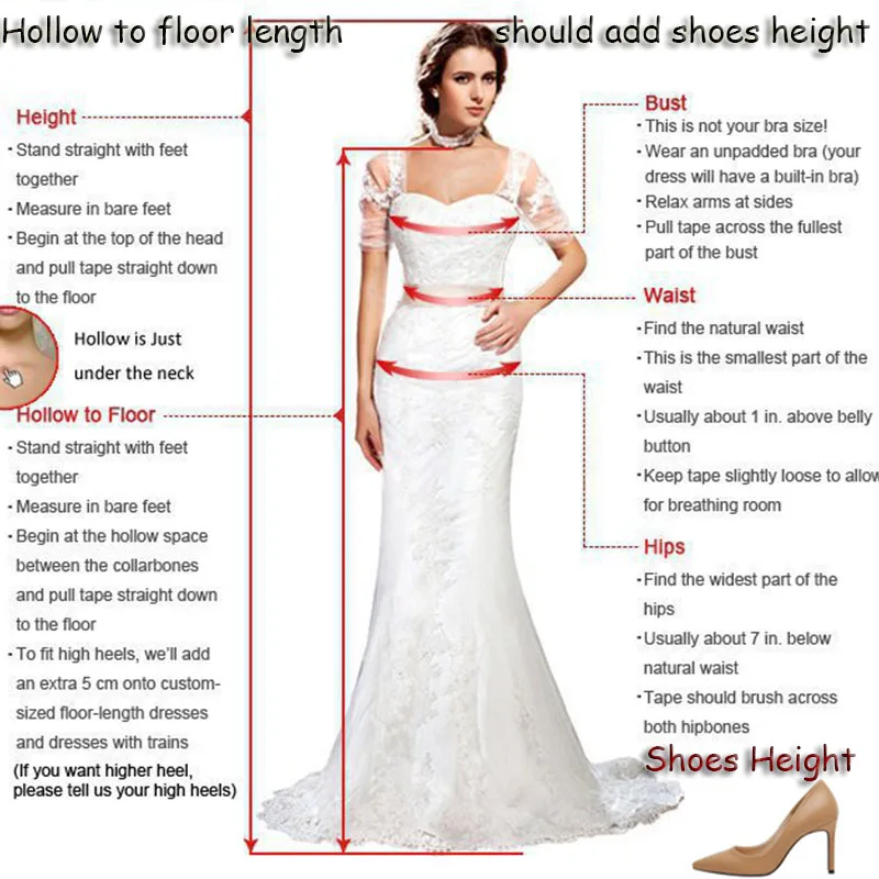 Площадка для тела Дюймы Cms 1. Бюст 2. Талия 3. Бедра 4. Верхний бюст 5. Под грудью 6. Соска для сосков 7. От плеча до груди 8. От плеча до талии 9. От плеча до плеча 10. Внешняя нога (от талии до пола с обувью) 11. Высота (от верха до пола с обувью) 12. Цвет платьяНапоминаем:Платье будет выделяться на основе строгих данных, которые вы предоставляете.