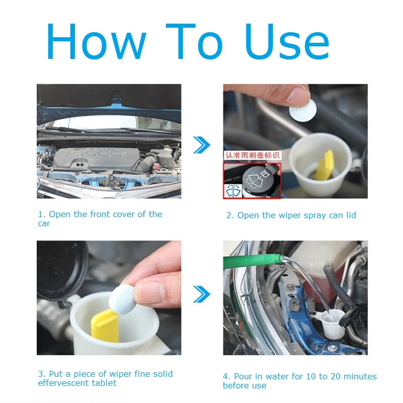 Этот продукт подходит при температуре выше нуля по Цельсию. Откройте капот автомобиля, найдите резервуар стеклоочистителя, заполните резервуар водой, добавьте кусок стеклоочистителя (если стекло слишком грязное, рекомендуется добавить 2 штуки), подождите 5 минут, а затем используйте как обычно. Кусок обычной воды можно обменять на 4 л воды. В соответствии с обычным объемом резервуара для хранения жидкости это кусок воды, который может заменить и превосходить традиционную стеклянную воду!
