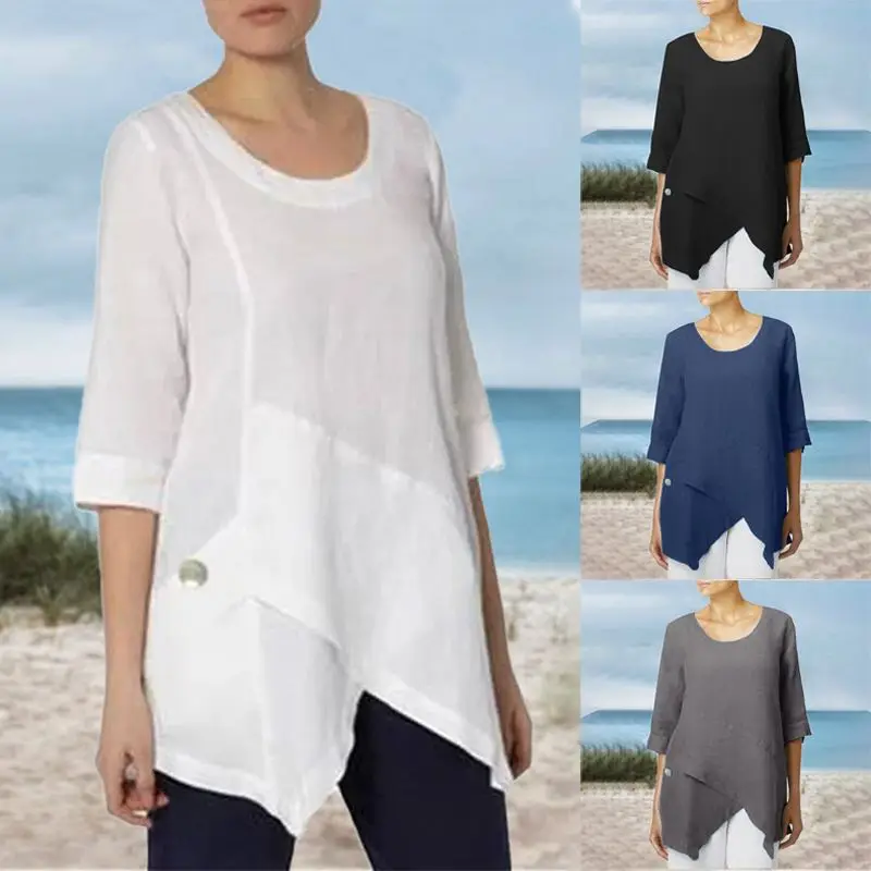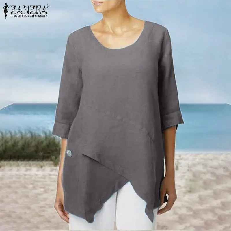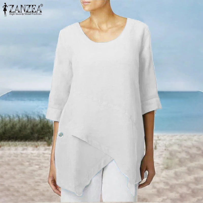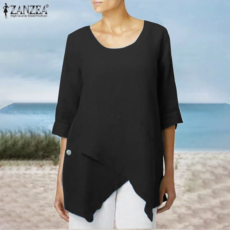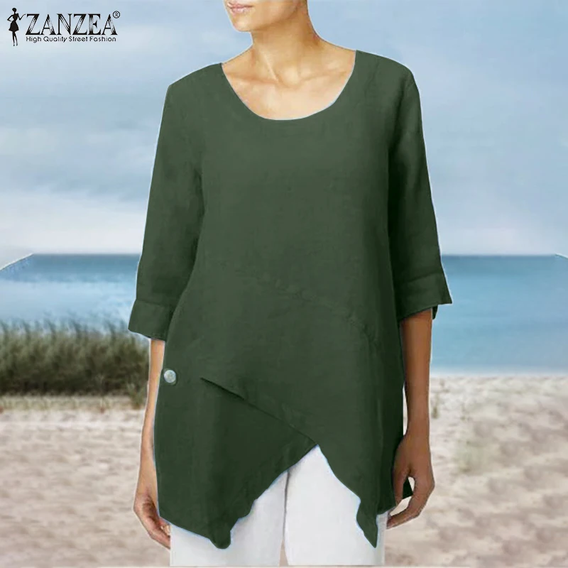 ZANZEA элегантная рубашка 2021 женская блузка с рукавом 34 женская блузка на пуговицах с круглым вырезом Повседневная Асимметричная туника