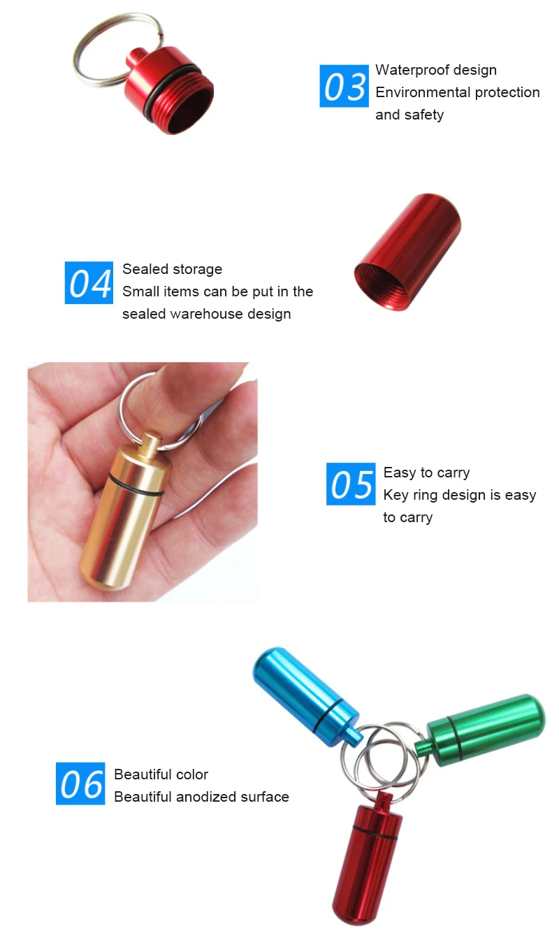 3. Герметичная кабина изготовлена из алюминиевого сплава. Поверхность изделия анодированная, водонепроницаемая и износостойкая. Крышку можно открутить. Есть уплотнительное кольцо, которое может быть водонепроницаемым. С внутренней стороны картридж Чехол очень чистое. Это используется для Аварийная медицина или обычная медицина, небольшой кремний, рыболовный крючок, леска и другое снаряжение для выживания. Подвесное кольцо удобно использовать.