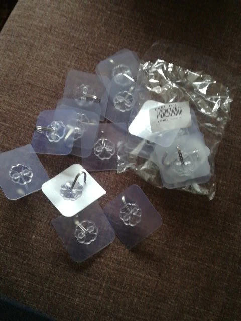 Наконец то, наконец то я получила эти крючки! Третий раз! В первые 2 раза просто терялись где то))) вообщем, крючки реально выдерживают все что захотите. Мой фен висит уже больше полугода и не падает) а также всякие корзинки и тд-всю стену увешала)))