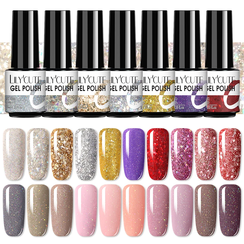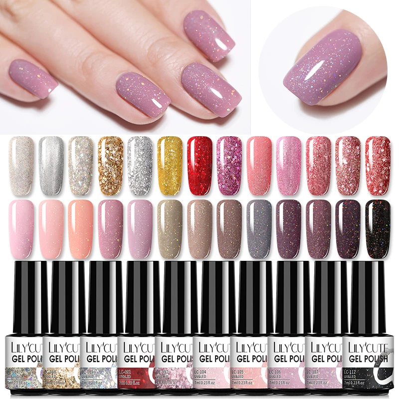 Гель-лак LILYCUTE 7 мл с блестками полуперманентный отмачиваемый для ногтей, Гель-лак для самостоятельного дизайна ногтей