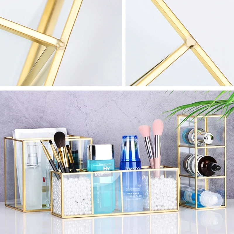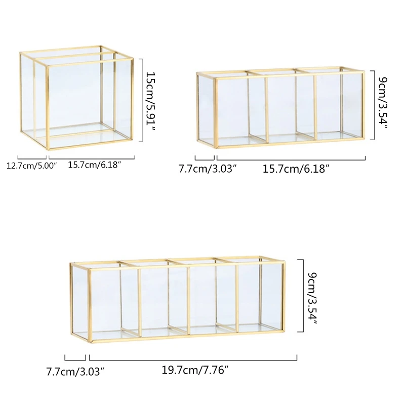 Особенности:Стеклянный держатель кистей для макияжа: латунные края и прозрачное стекло бесшовная сваркаСовременная стеклянная коробка Exquisit: элегантный стеклянный держатель с прослойкой.Прочная стеклянная безделушка Organzier: Организация ваших любимых ювелирных изделий, безделушек, колец, сережек, тушков, ожерелий, кистей для макияжа, косметических инструментов, подводки для глаз, кисти для ресниц, помады или карандашей tc.Многоцелевой держатель для хранения ювелирных изделий: подходит для драгоценностей, безделушек в декоративном комоде, столешницы, ювелирных изделий на дисплее, держателей для канцелярских ручек. Идеально подходит для подарка на день рождения, девочек, любителей макияжа. Спецификация:Материал: латунь + стеклоРазмер:Две сетки: 15,7x15x12,7 см 830 гС тремя отсеками: 15,7x9x7,7 см 500 гЧетыре сетки: 19,7x9x7,7 см 636 гЦвет: ЗолотойПримечание: